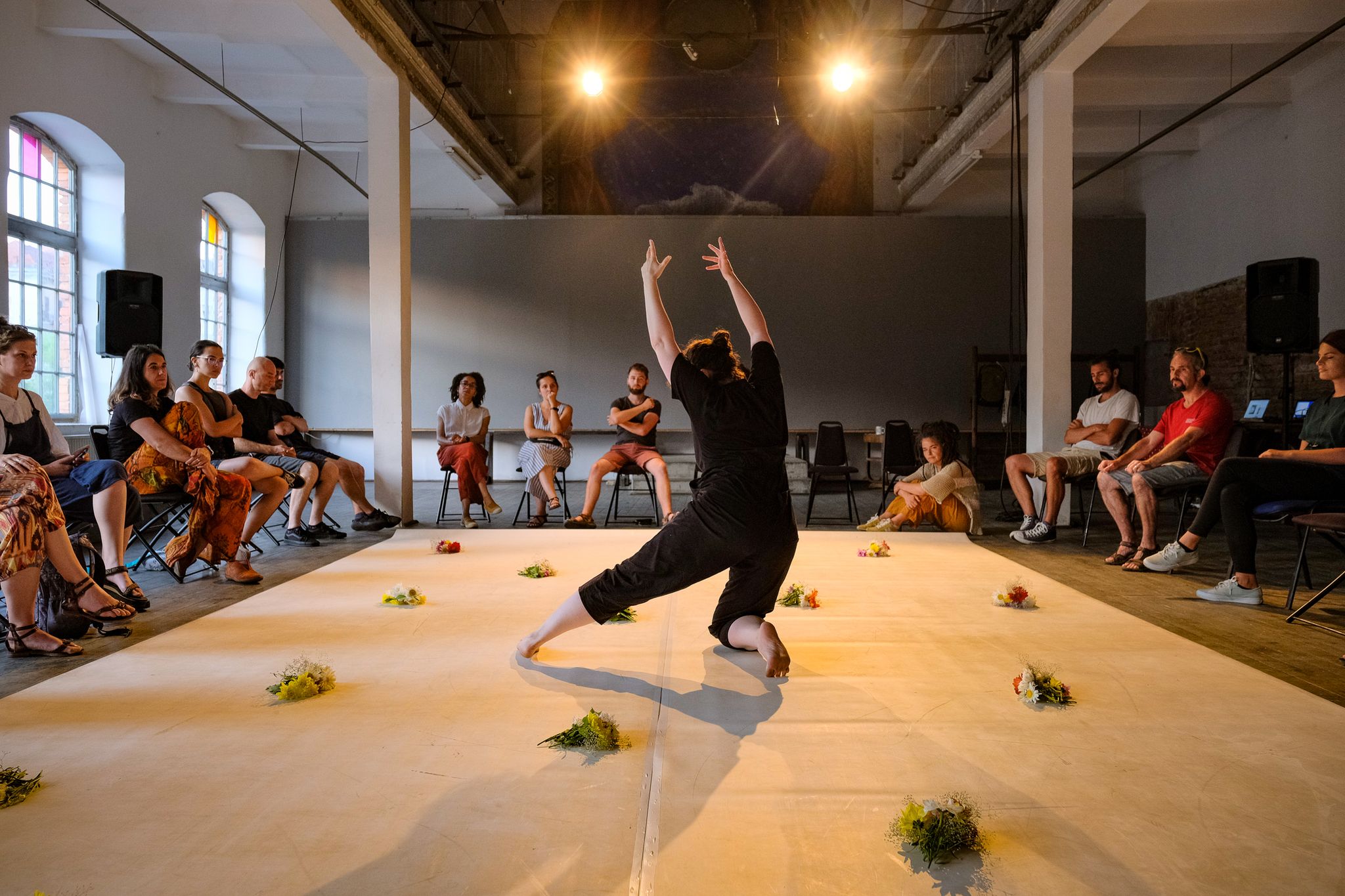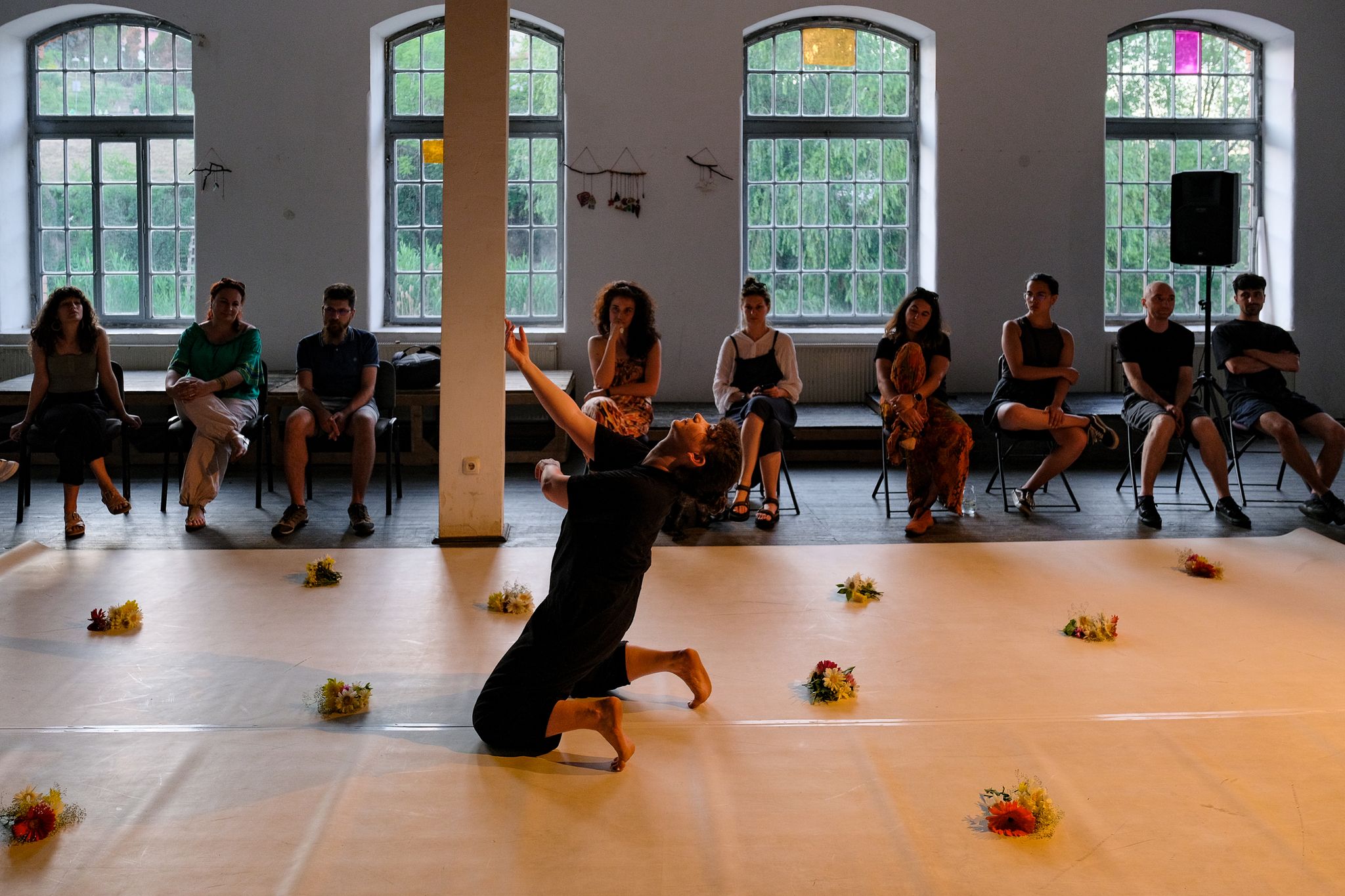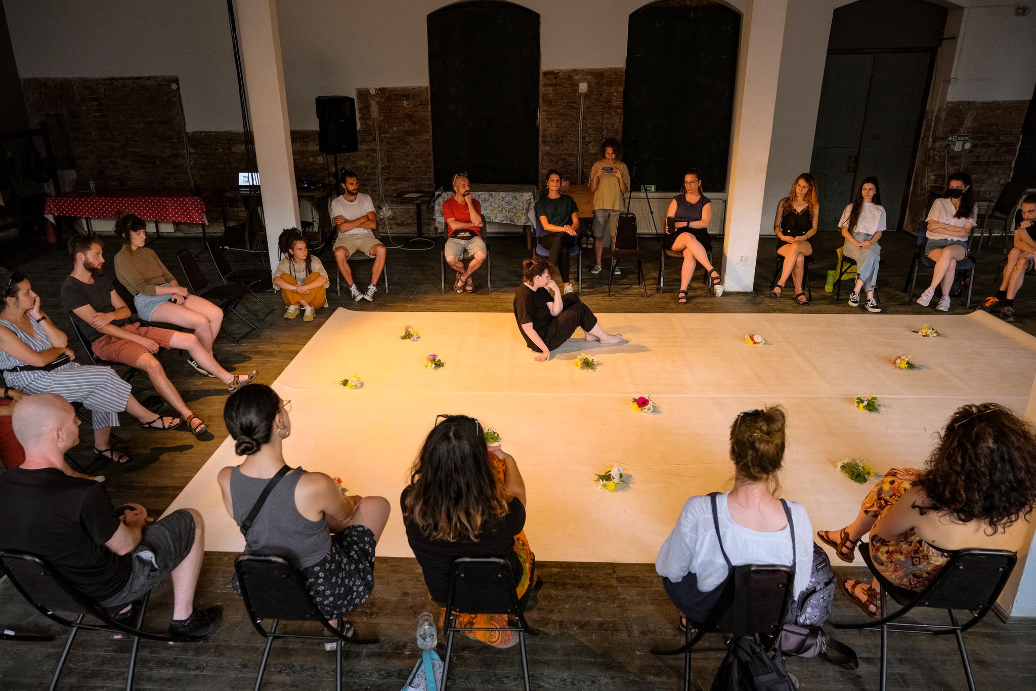 Andreea Novac: Mă feresc, în general, să pun etichete. Eu îi spun incursiune performativă, în sensul că nu e un spectacol per se, deși are ingredientele unui spectacol, dar cred că miza lui nu este în spectacular sau în iluzia spectaculară, ci mai degrabă într-un fel de a aduce oamenii împreună, de a crea un context pentru a fi împreună, de a vorbi despre niște lucruri pe care le resimțim cu toții sau pe care le cunoaștem cu toții, într-un fel sau altul, dar într-o manieră care nu pune o presiune de un anumit fel. Formatul acesta e un pic fluid, adică ceea ce fac eu pe scenă se schimbă în funcție de orașul în care îl prezint – conținutul, asta spun. Se schimbă playlist-ul, se schimbă textul, florile rămân și mișcarea aproape rămâne, pentru că practic, tot ce fac eu pe scenă este extras din discuțiile pe care le am cu artiștii din diverse orașe despre viața de artist independent sau despre ce înseamnă să ai un spațiu independent sau pur și simplu despre felul în care ei vor să construiască ceva artistic pentru orașul lor.