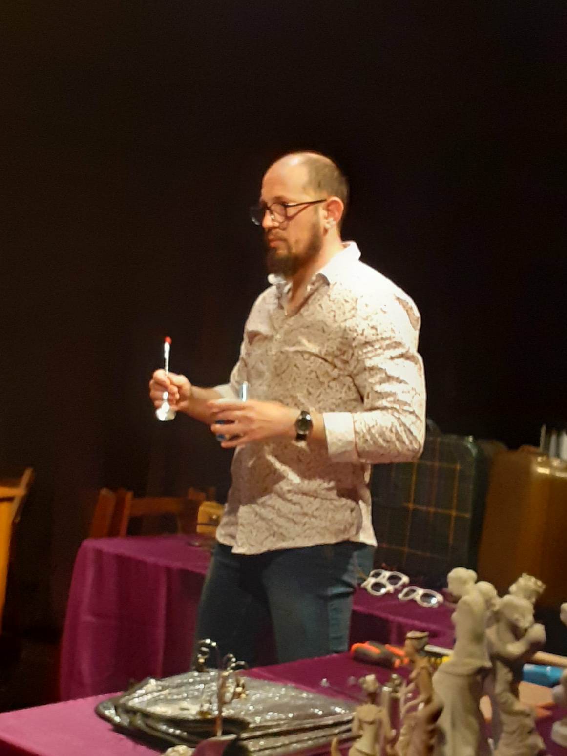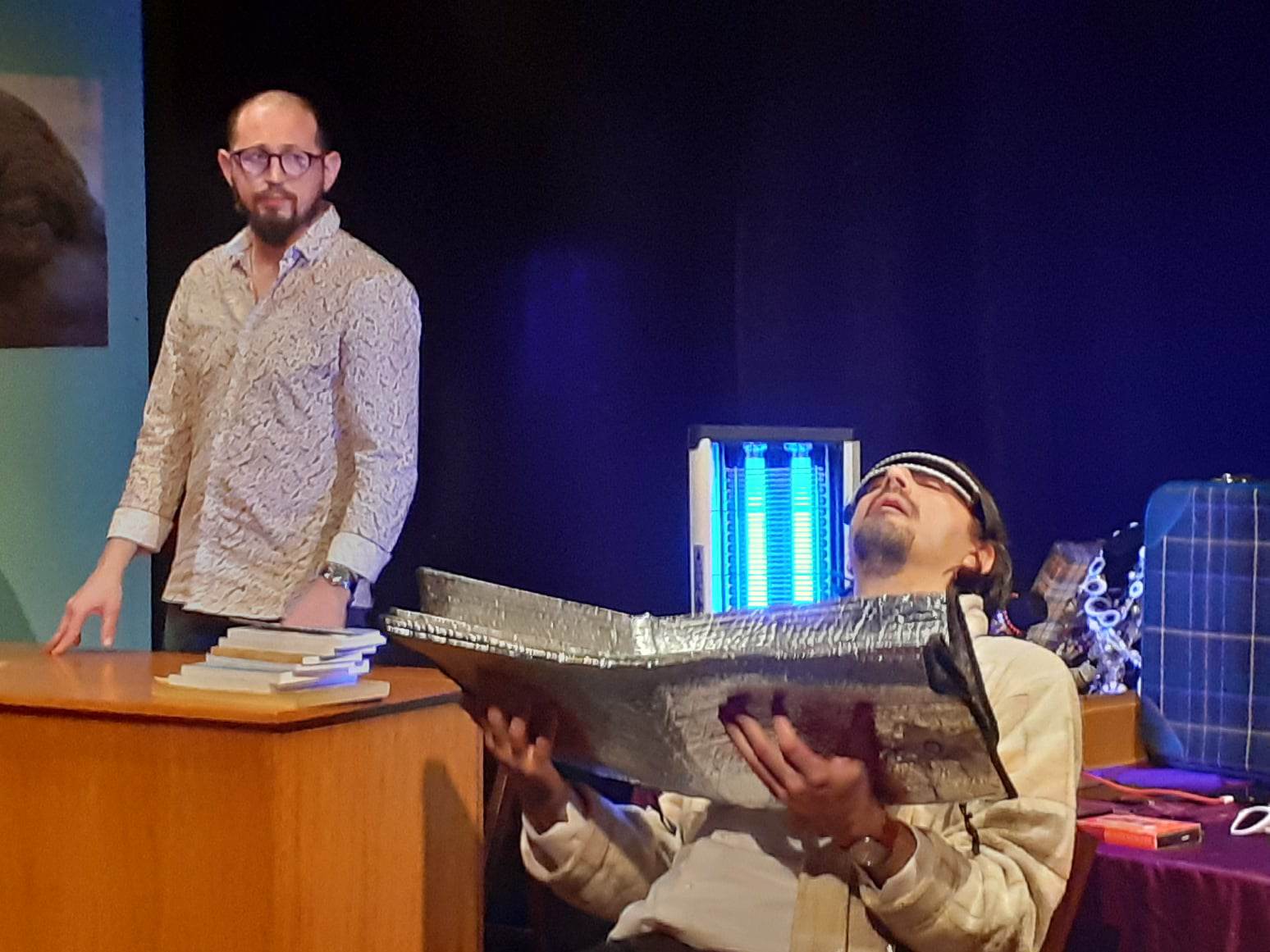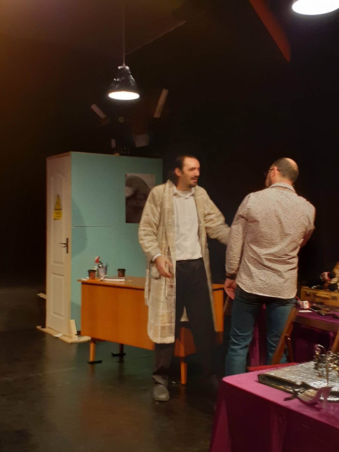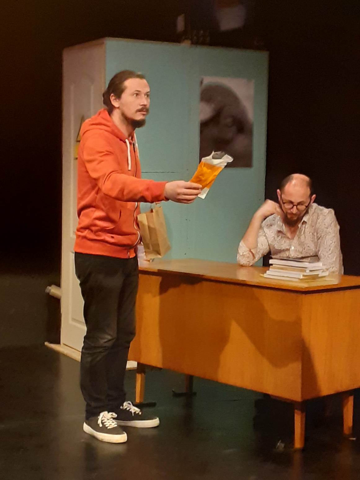 Actorul Sebastian Bădărău, absolvent de Teatru la Universitatea “Babeș Bolyai” din Cluj Napoca, un ieșean revenit, nu de multă vreme acasă, îl joacă pe Teach (Dom’ Profesor). Interpretarea sa este savuroasă, plină de energie și umor, subliniind contrastul cu finalul trist pe care îl oferă textul lui David Mamet: prăbușirea în neputința de a fi indispensabil pentru cei din jur.