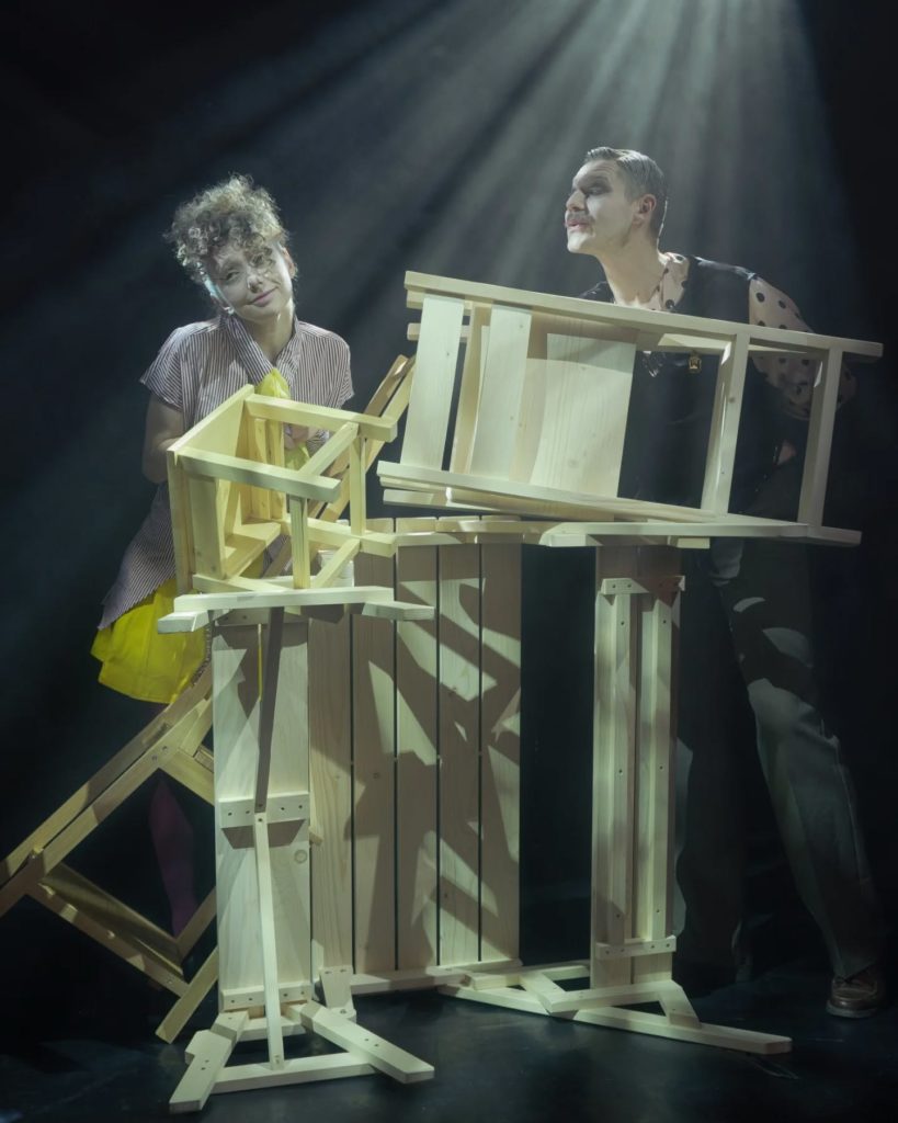 Următoarea seară, tot la Sala „Uzina cu Teatru”, am urmărit un performance al coregrafilor Alice Veliche și Radu Alexandru. „Take a seat”, după „Scaunele” de Eugen Ionescu.