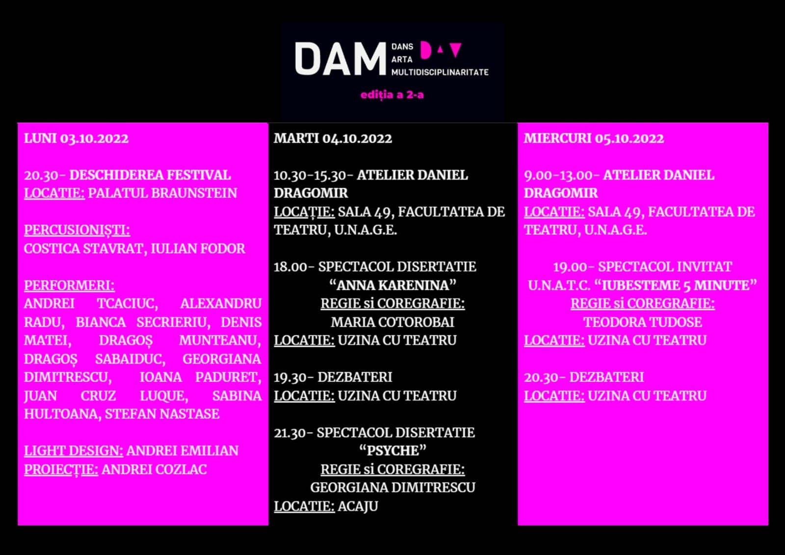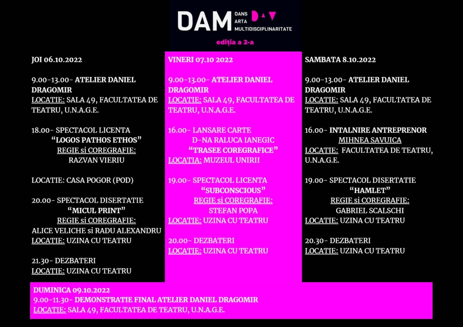 DAM are scopul de a promova tinerii coregrafi, absolvenți ai Universității Naționale de Artă “George Enescu” din Iași. Cu atât mai mult cu cât la Iași, a exsitat, la un moment dat, singurul festival de dans contemporan din țară, EURODANS, a spus conf. univ. dr. Lorette Enache: