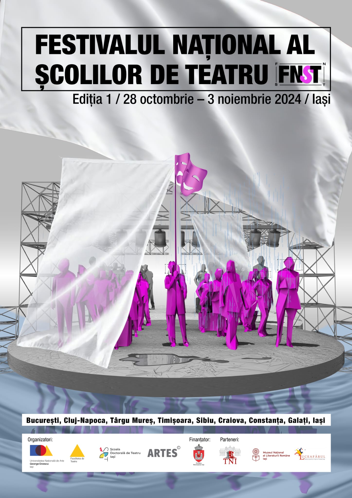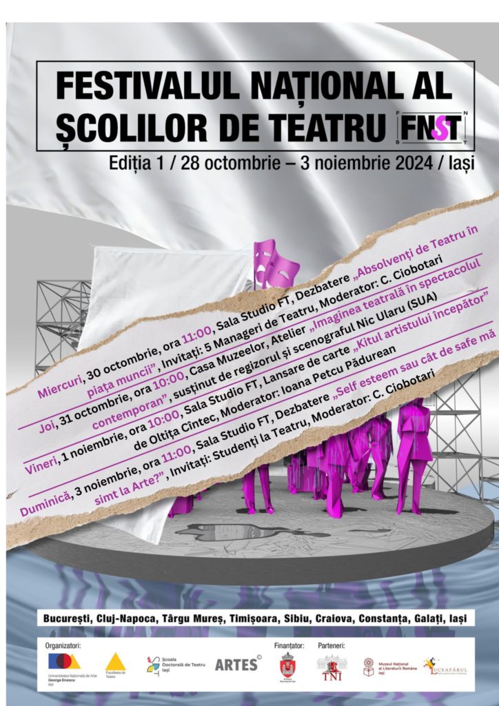 Astăzi, a început, la Iași, prima ediție a Festivalului Național al Școlilor de Teatru organizat de Facultatea de Teatru a Universității Naționale de Arte „George Enescu” și de Școala Doctorală de Teatru, prin Asociația ARTES.