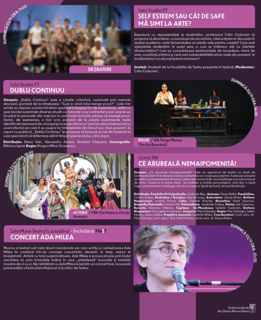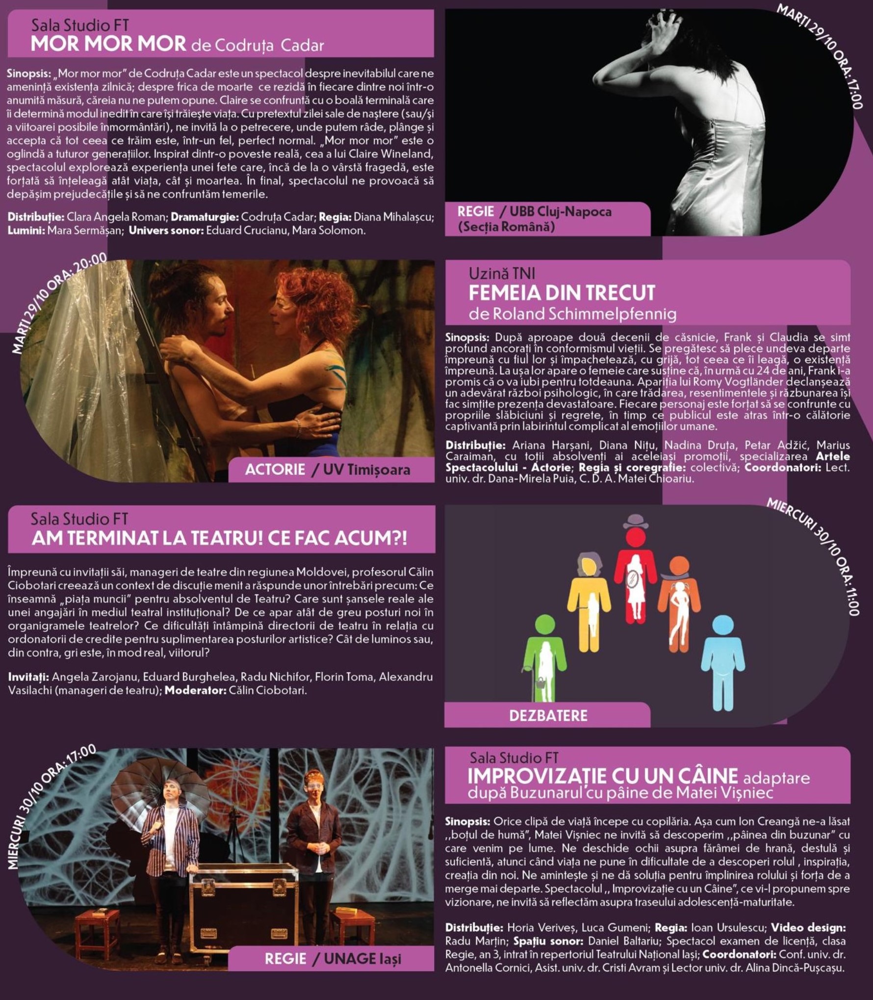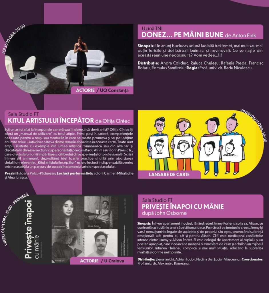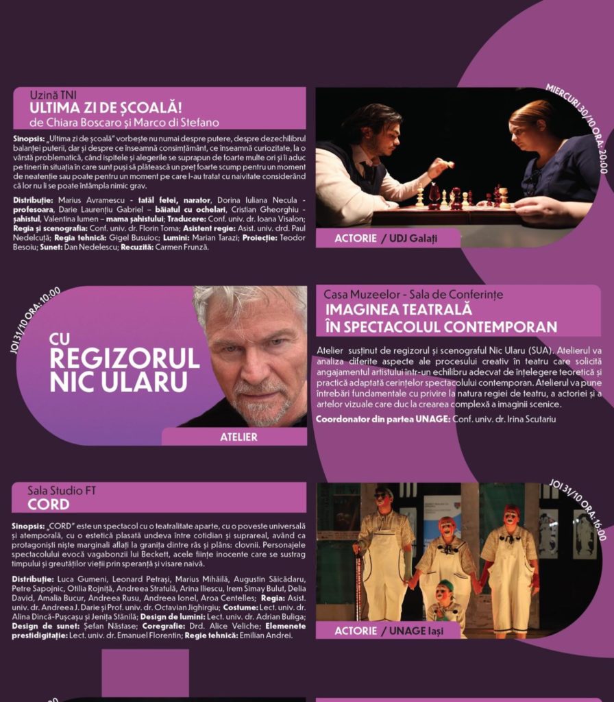 Până pe 3 noiembrie, se desfășoară, la Iași, prima ediție a Festivalului Național al Școlilor de Teatru. În fiecare după-amiază, sunt prezentate spectacole ale celor opt școli de teatru prezente, iar dimineața, au loc dezbateri.