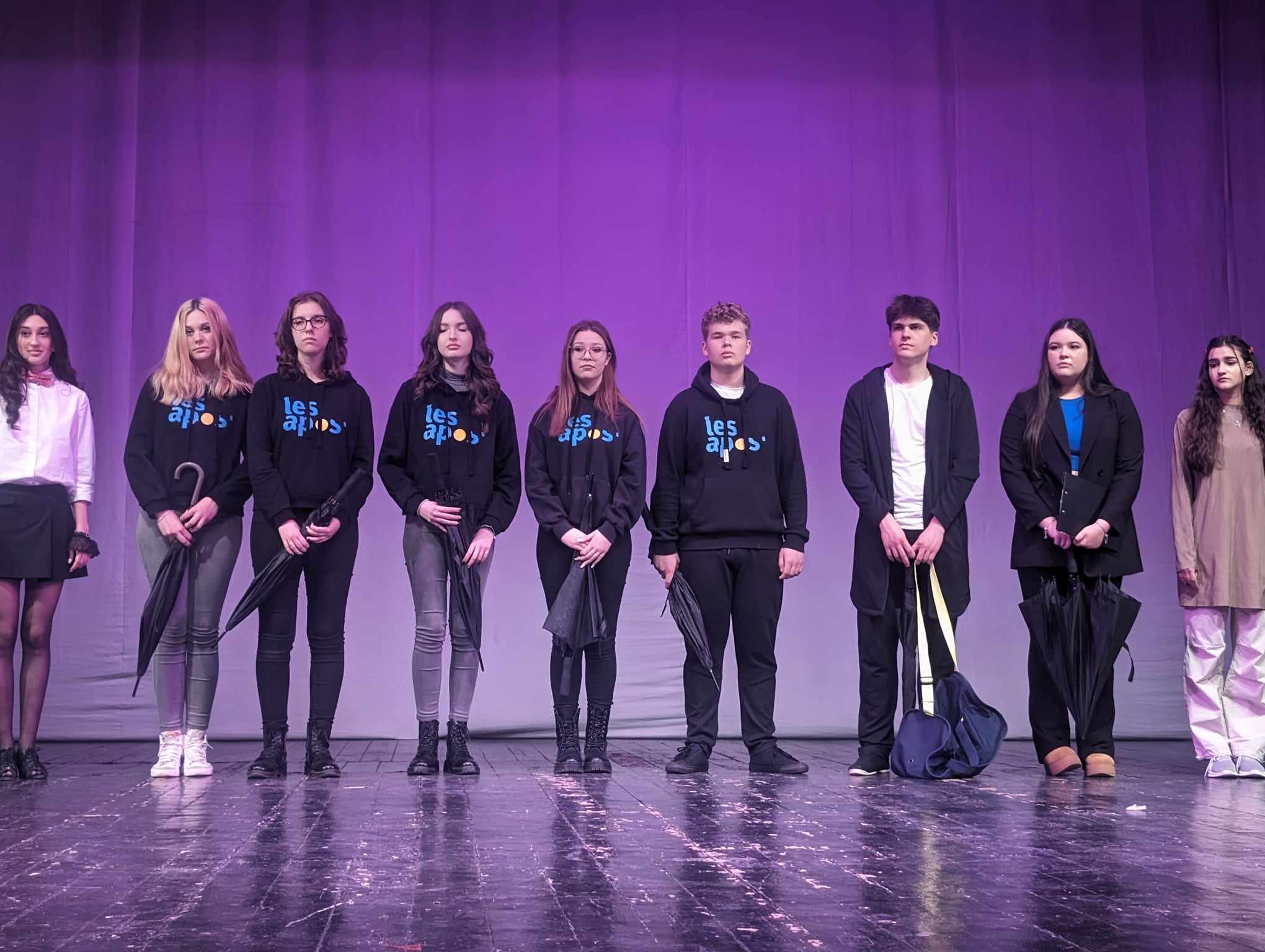 În anul 2008, ca urmare a interesului crescând al elevilor pentru această activitate, a apărut un club de teatru, care s-a transformat imediat în trupa LES APOS’, mult mai numeroasă decât trupa MOOZ şi care şi-a propus să devină un spațiu de dezvoltare şi comunicare, o creație colectivă de spectacole în care corpul vorbeşte la fel de mult ca glasul, dansul înlocuieşte deseori interpretarea clasică, iar sfârşitul marchează o îndoială mai mult decât o certitudine.