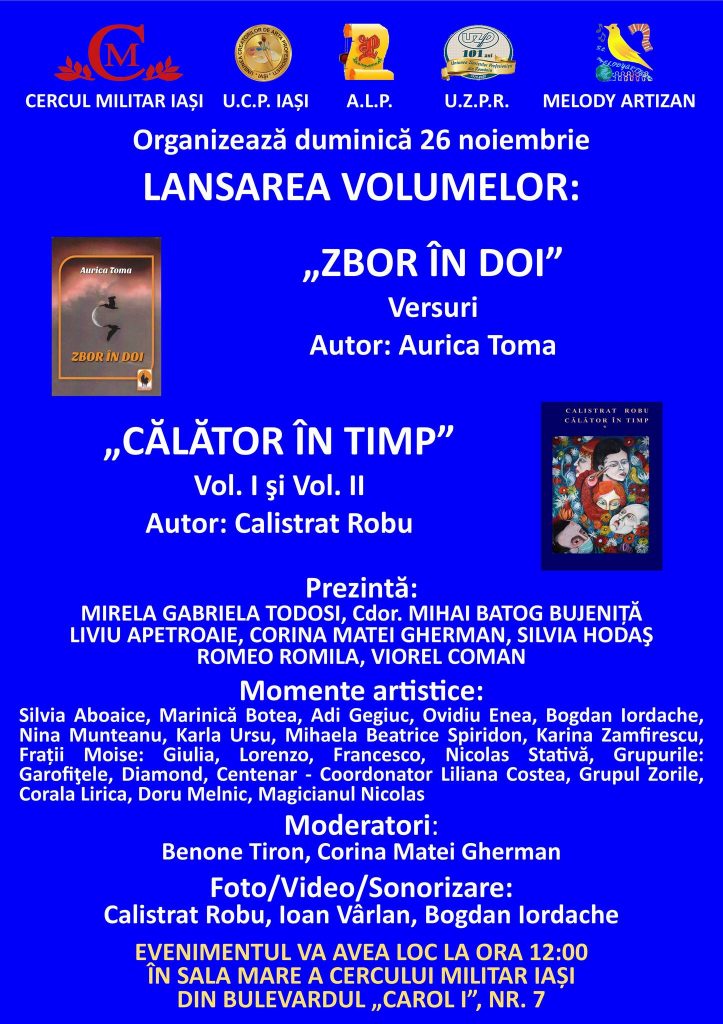 Calistrat Robu ne oferă amănunte și despre un interesant eveniment care va avea loc, la Iași, în ziua de duminică, 26 nov. a.c., începând cu ora 12, în Sala Mare a Cercului Militar (Bulevardul „Carol I”, Nr. 7), atunci când va fi lansată narațiunea CĂLĂTOR ÎN TIMP (vol. I și II).
