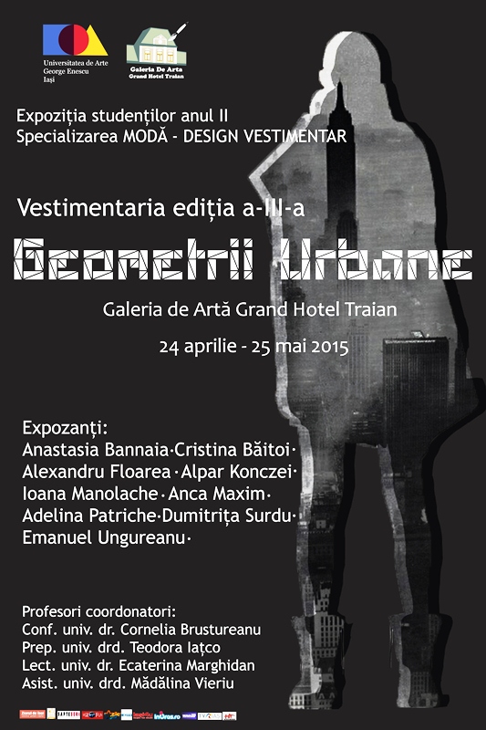 Expoziţia „Geometrii Urbane” marchează cea de-a treia ediţie a evenimentului „Vestimentaria” şi reuneşte zece piese de îmbrăcăminte. Expozanţi sunt studenţii în anul al II-lea de studiu la specializarea Modă – Design Vestimentar a Facultăţii de Arte Vizuale şi Design, din cadrul Universităţii de Arte „George Enescu” Iaşi.