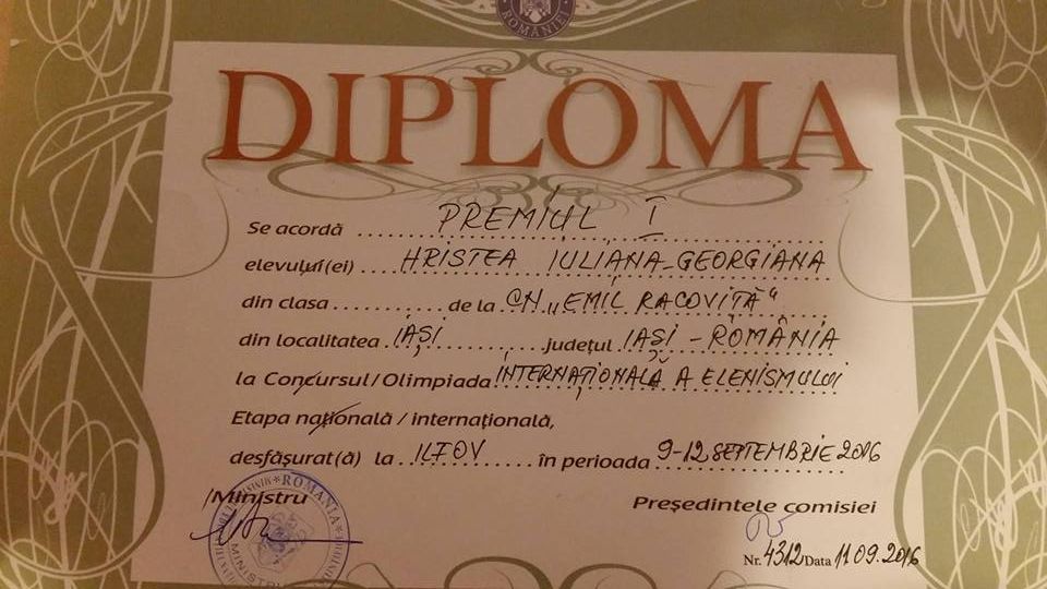 În această ediție a emisiunii România de nota 10, facem cunoștință cu o tânără ieșeancă îndrăgostită de limba, cultura și civilizația elenă. Se numește Iuliana Georgiana Hristea și primul contact cu limba neogreaca l-a avut în anii copilăriei, când a locuit o perioada de timp cu familia în Grecia.