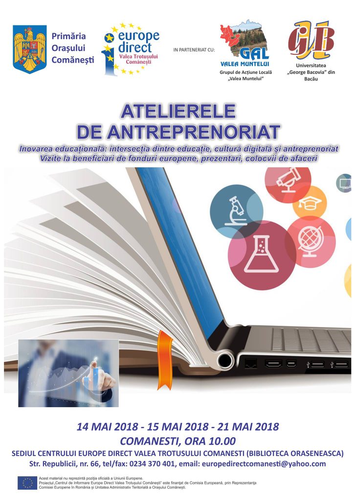 Primăria orașului Comănești și Centrul de Informare Europeană „Europe Direct Valea Trotușului Comănești” au organizat în parteneriat cu Universitatea „George Bacovia” din Bacău, Grupul de Acțiune Locală „Valea Muntelui” și Inspectoratul Școlar Județean Bacău, o serie de 3 ateliere de antreprenoriat intitulate „Inovarea educațională – intersecția dintre educație, cultură digitală și antreprenoriat”, dedicate elevilor, studenților, viitorilor antreprenori, consultanților în afaceri, cadrelor universitare din domeniu, și multi alții.