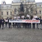 Mai mulți reprezentanți ai USR Iași au protestat, astăzi, în fața Primăriei solicitând demisia primarului Mihai Chirica din cauza dosarelor penale ale acestuia. Reprezentanții USR au afișat un banner și pancarte și au explicat trecătorilor motivul protestului.