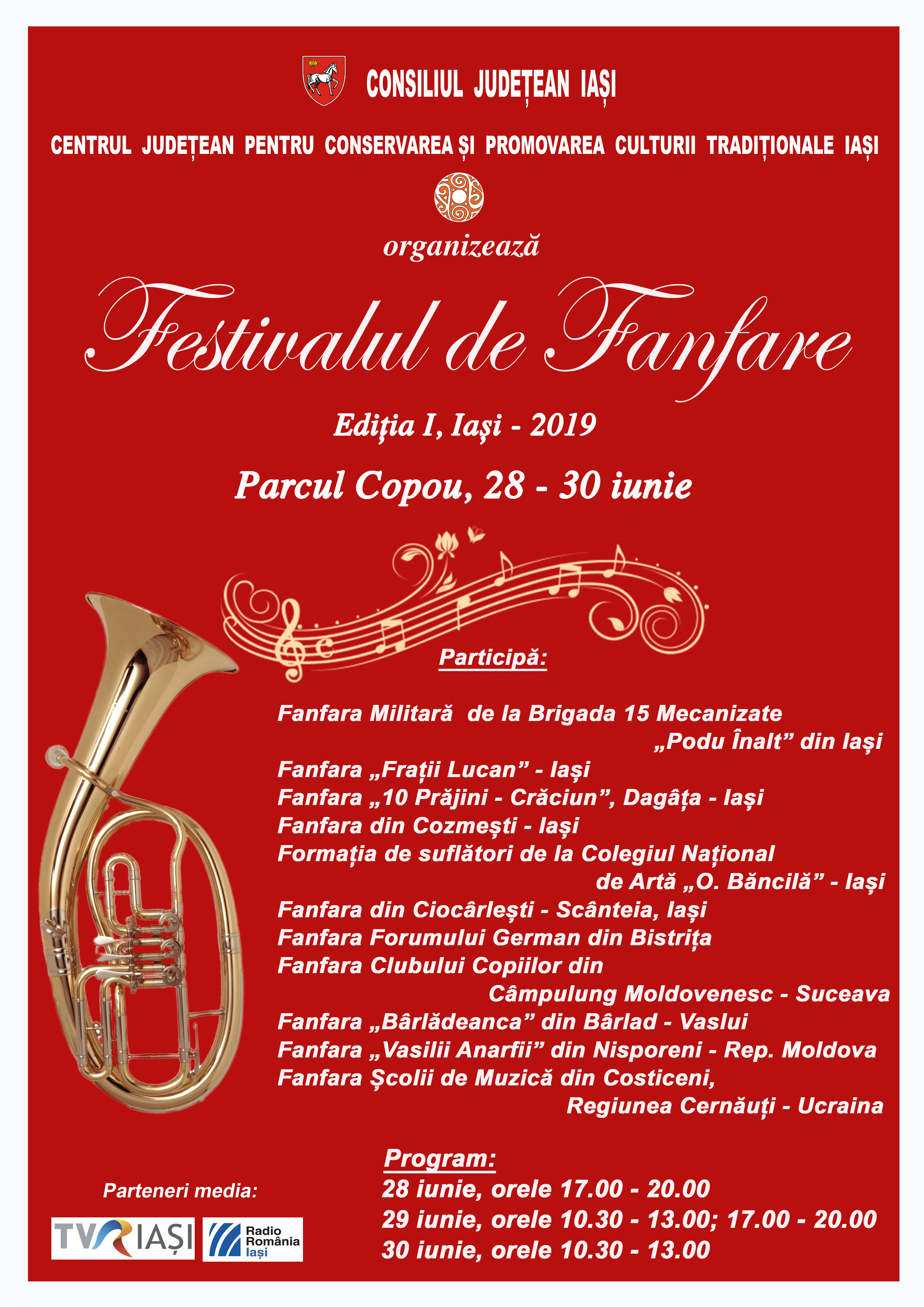 În perioada 28-30 iunie, în Parcul Copou, se va desfășura Festivalul de fanfare, ediția I, Iași – 2019. Evenimentul este organizat de Consiliul Judeţean Iaşi, prin Centrul Judeţean pentru Conservarea şi Promovarea Culturii Tradiţionale Iaşi.