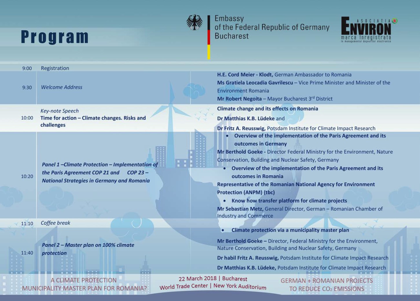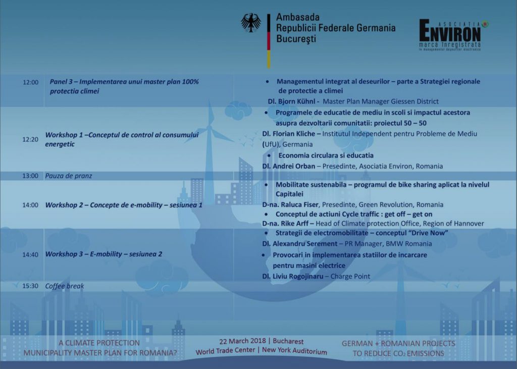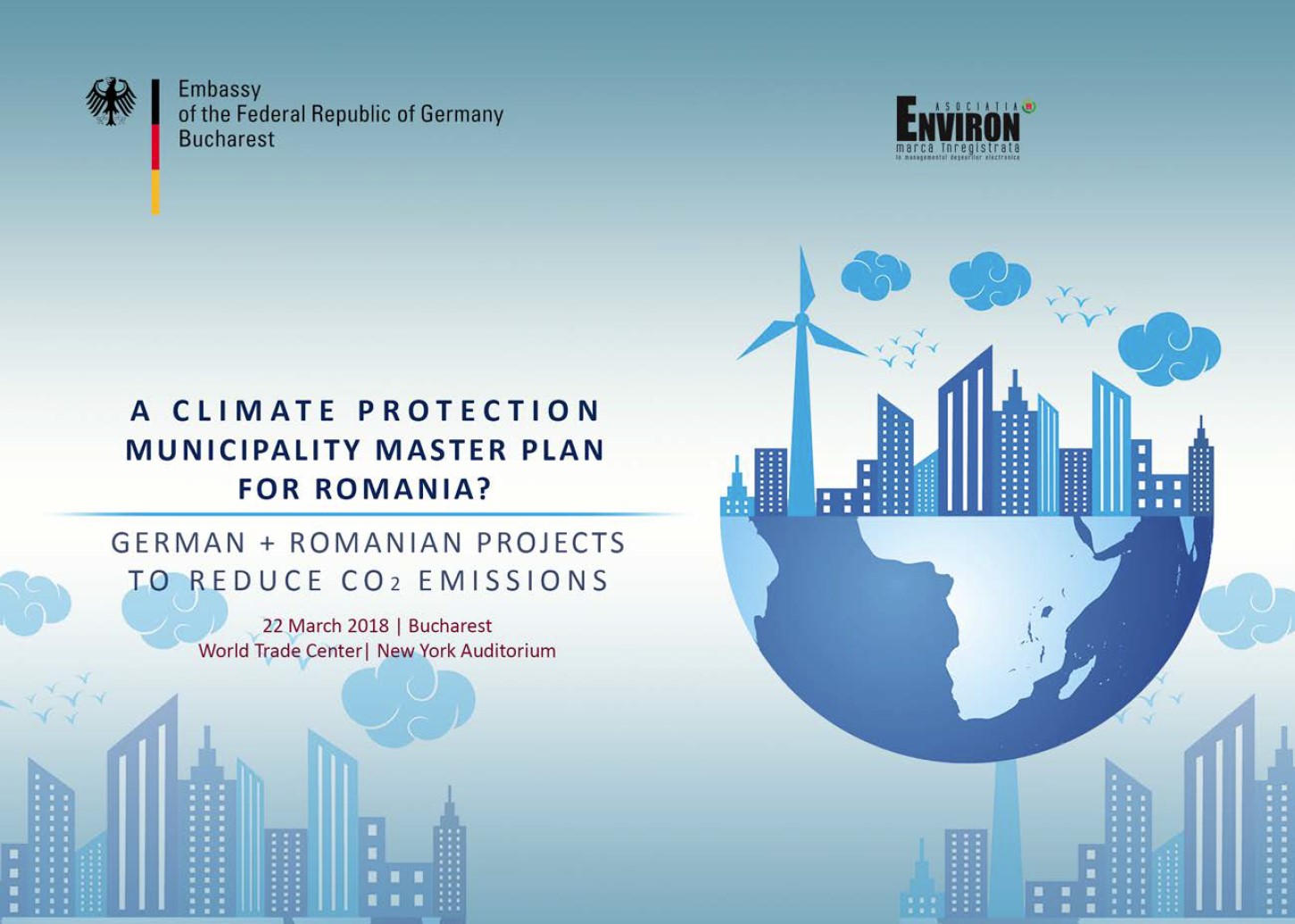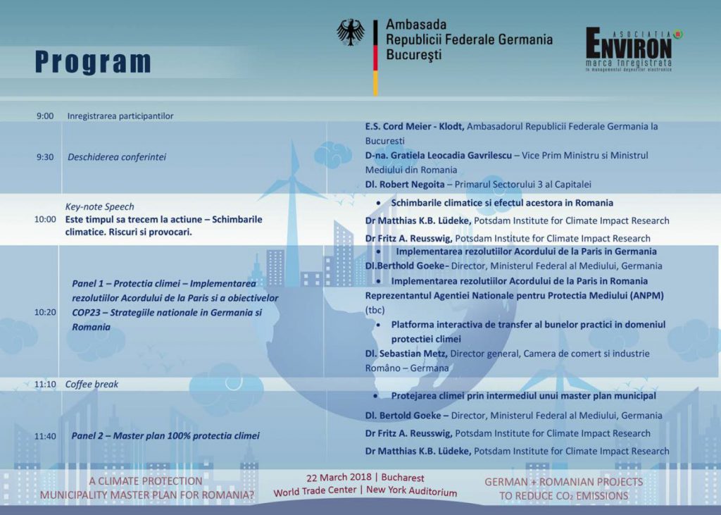 Ambasada Germaniei la Bucureşti şi Asociaţia Environ organizează, în 22 martie, la World Trade Center din Bucureşti, Sala „New York Auditorium”, o conferinţă despre schimbările climatice şi protecţia climei, în special pe plan local.
