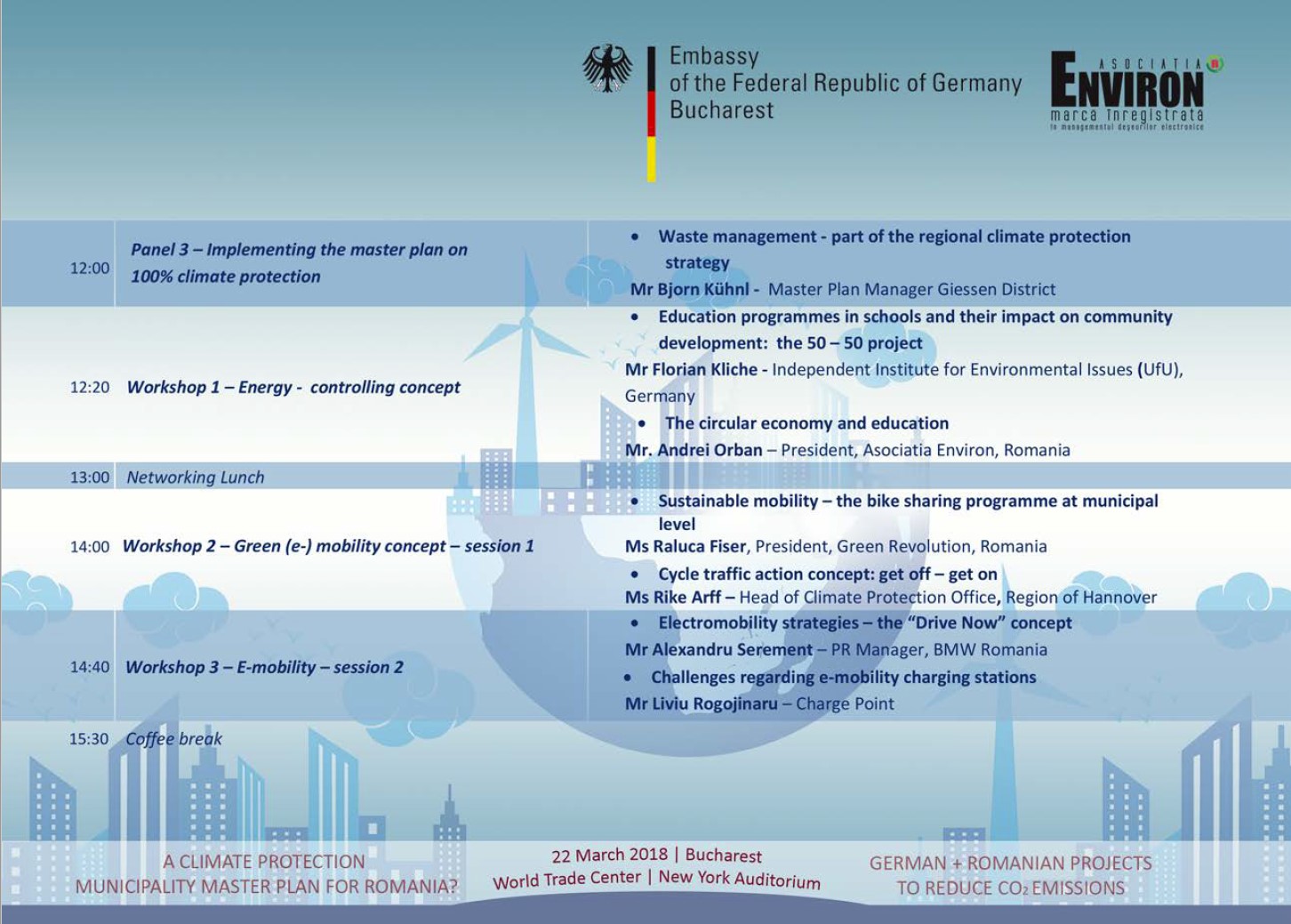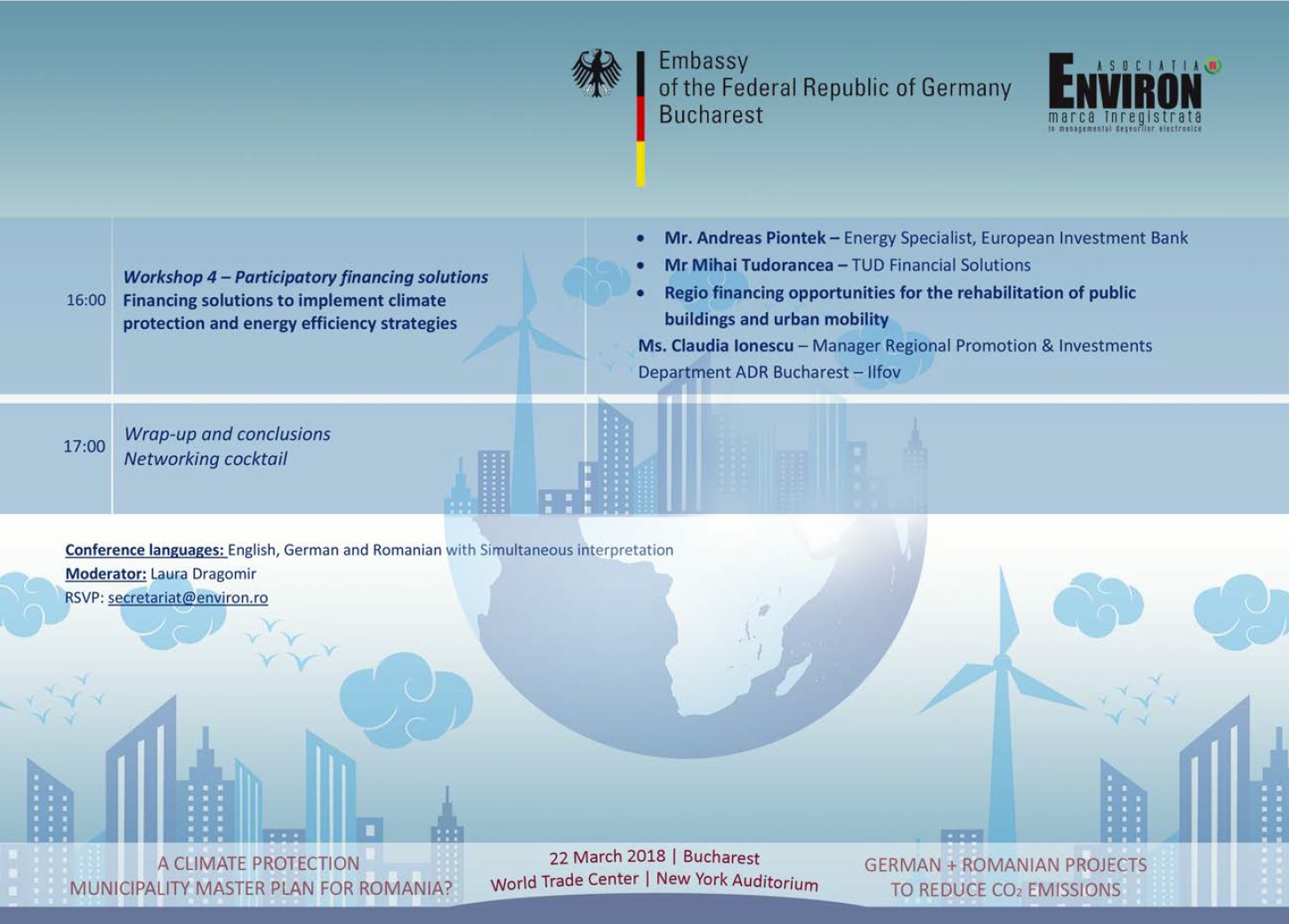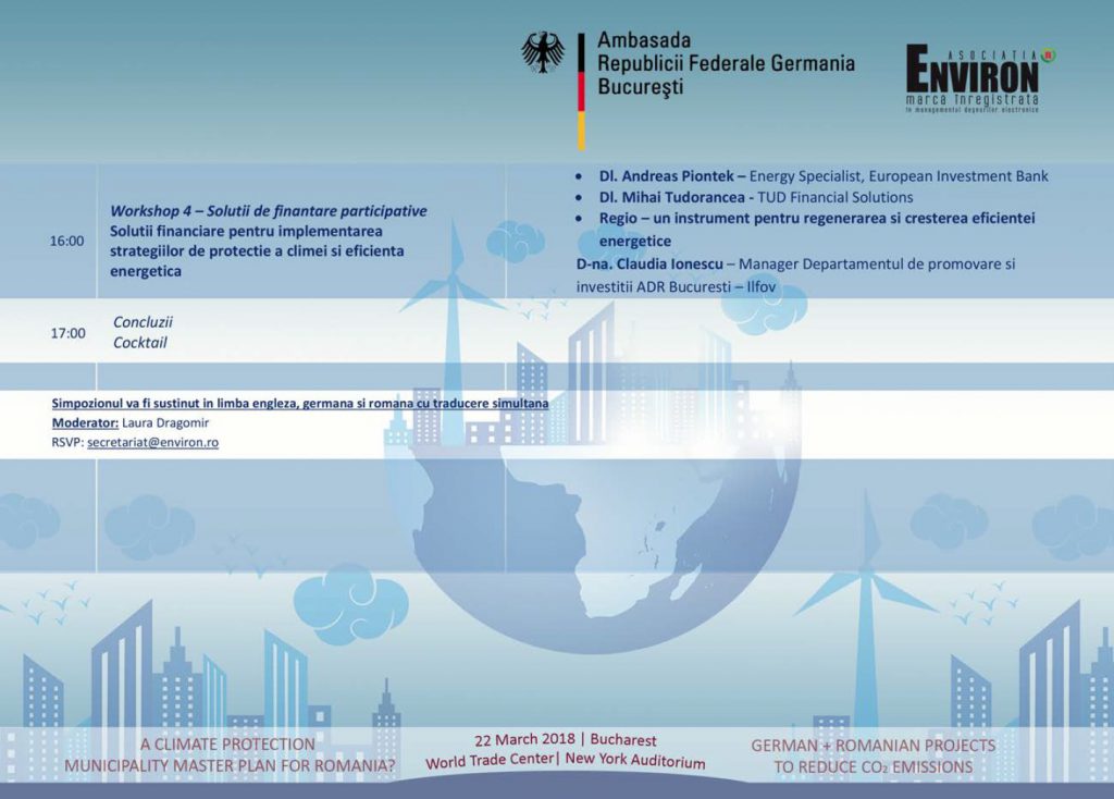 Ambasada Germaniei la Bucureşti şi Asociaţia Environ organizează, în 22 martie, la World Trade Center din Bucureşti, Sala „New York Auditorium”, o conferinţă despre schimbările climatice şi protecţia climei, în special pe plan local.