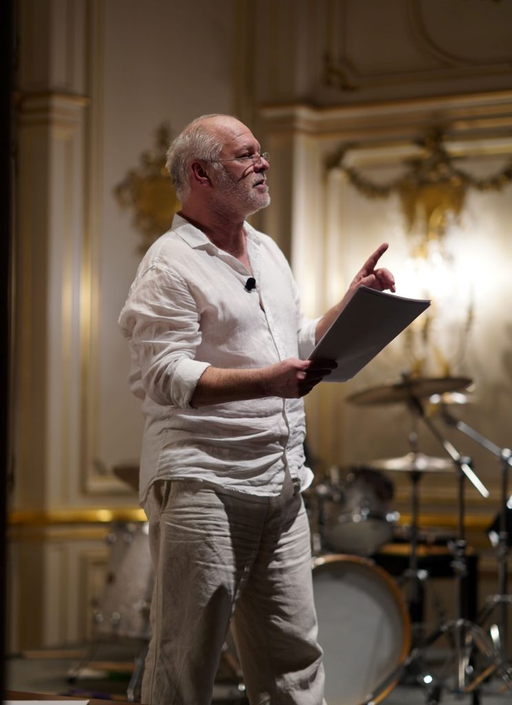 Timp de peste o oră, interpretarea lirică a actorului Vlad Ivanov a fost completată prin intervențiile de percuție susținute de Lucian Maxim, considerat unul dintre cei mai mari percuționiști români. Pe parcursul spectacolului, cei doi artiști s-au aflat într-un dialog hibrid și au interacționat direct cu publicul participant.