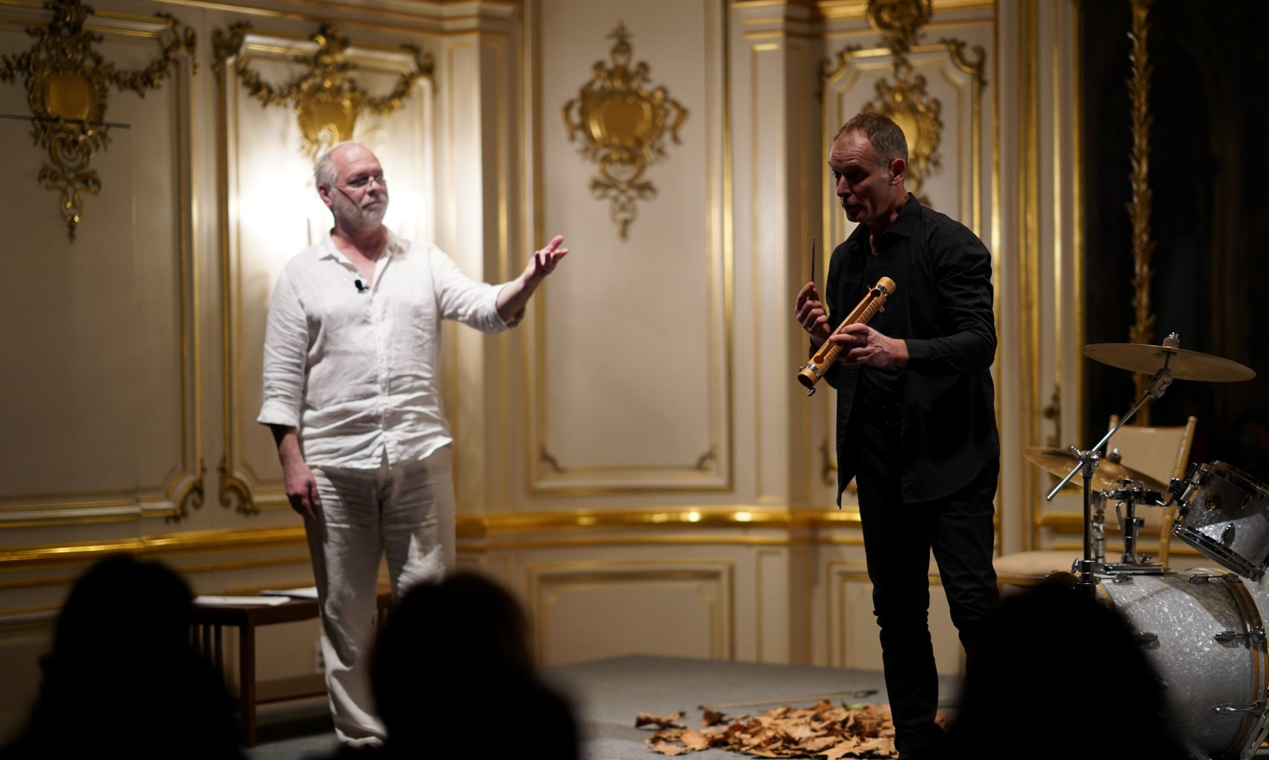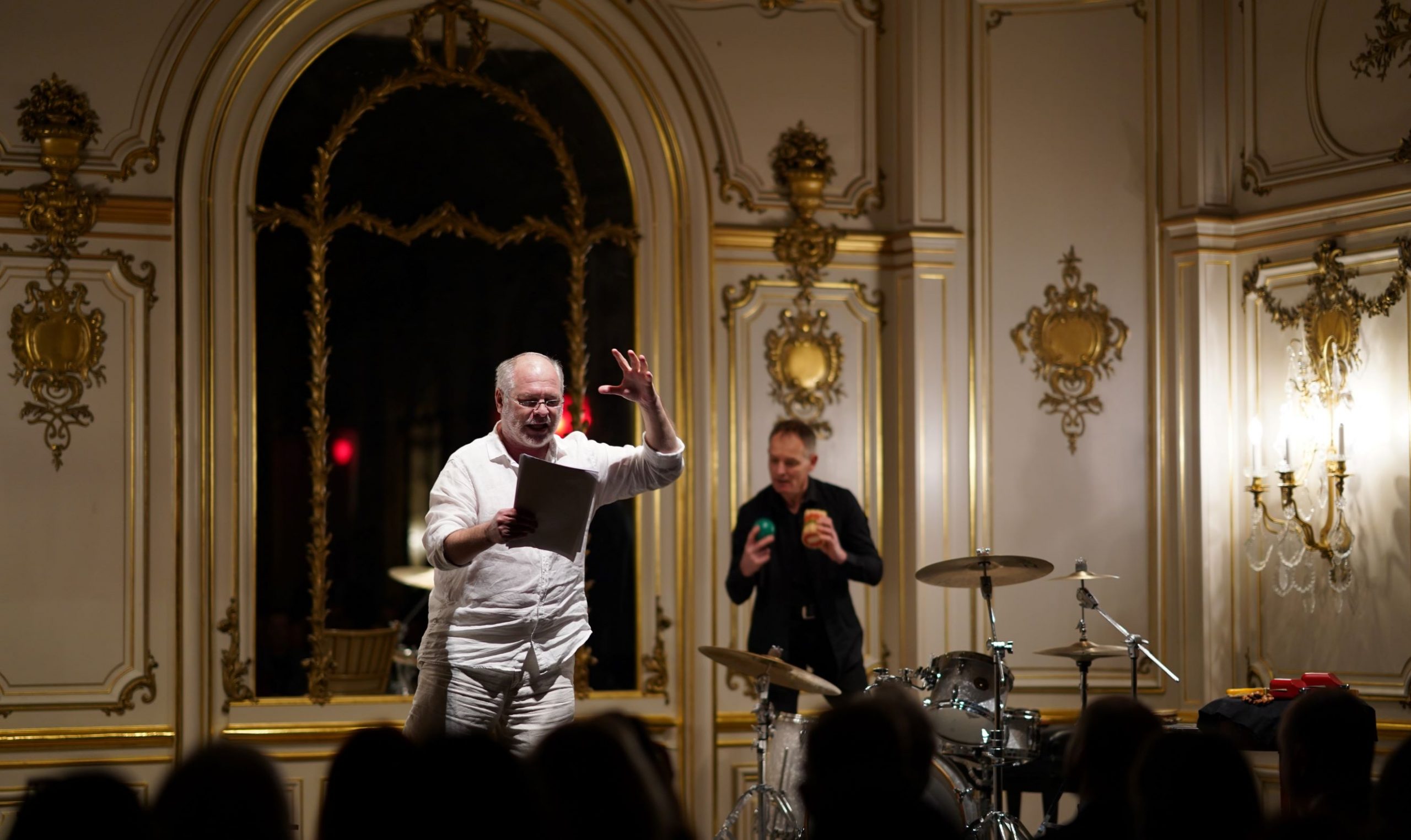 Timp de peste o oră, interpretarea lirică a actorului Vlad Ivanov a fost completată prin intervențiile de percuție susținute de Lucian Maxim, considerat unul dintre cei mai mari percuționiști români. Pe parcursul spectacolului, cei doi artiști s-au aflat într-un dialog hibrid și au interacționat direct cu publicul participant.