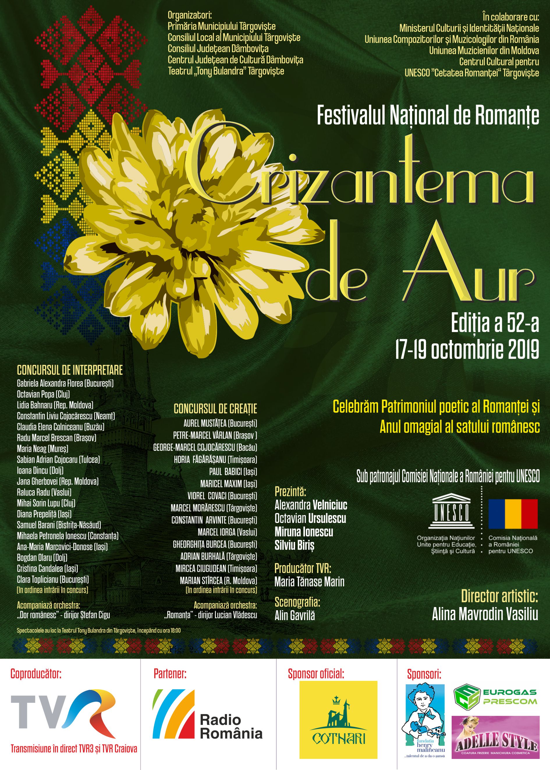În perioada 17-19 octombrie 2019, se desfăşoară în municipiul Târgovişte, sub patronajul Comisiei Naţionale a României pentru UNESCO, ediţia LII a Festivalului Naţional de Interpretare şi Creaţie a Romanţei „Crizantema de aur”.