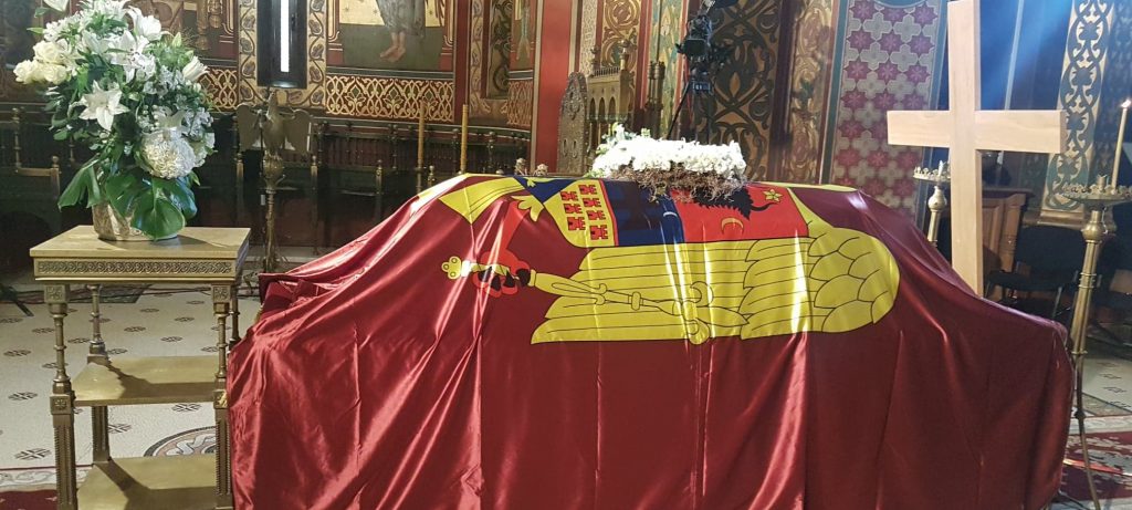 Opt militari de la Batalionul 33 Vânători de Munte ‘Posada’ din Curtea de Argeş au purtat sicriul din maşină în vechea catedrală şi l-au aşezat pe catafalc, cu crucea de lemn, stindardul Reginei-Mamă şi coroana cu flori albe.