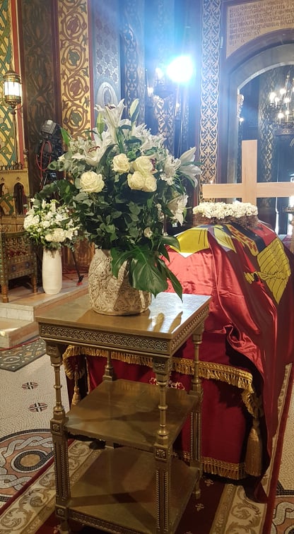Opt militari de la Batalionul 33 Vânători de Munte ‘Posada’ din Curtea de Argeş au purtat sicriul din maşină în vechea catedrală şi l-au aşezat pe catafalc, cu crucea de lemn, stindardul Reginei-Mamă şi coroana cu flori albe.