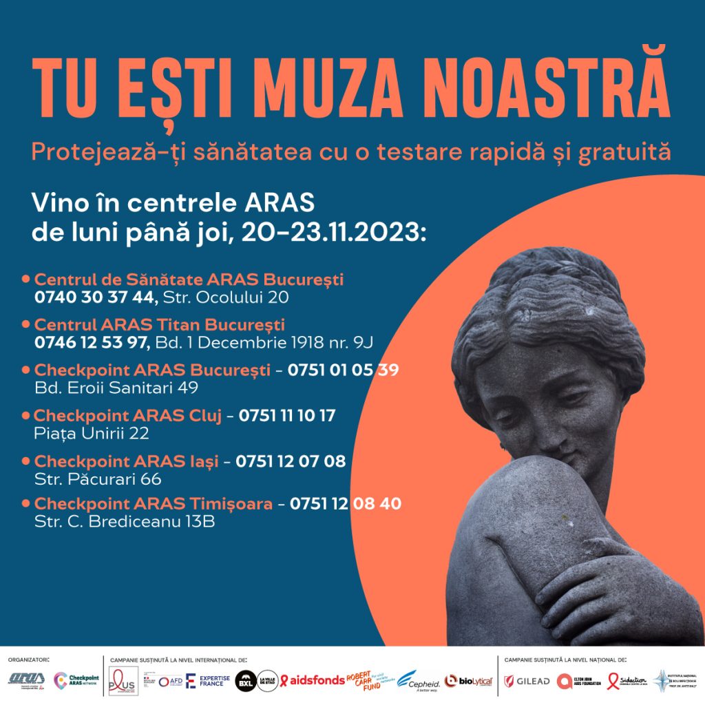 În perioada 20-23 noiembrie 2023, vă puteți testa gratuit și anonim, pentru HIV, Sifilis, Hepatită B și C, în următoarele centre ARAS: Checkpoint ARAS București 0751010539, Checkpoint ARAS Cluj 0751111017, Checkpoint ARAS Iași 0751120708, Checkpoint ARAS Timișoara 0751120840, Centrul de Sănătate ARAS 0740303744, Centrul ARAS Titan București 0746125397,