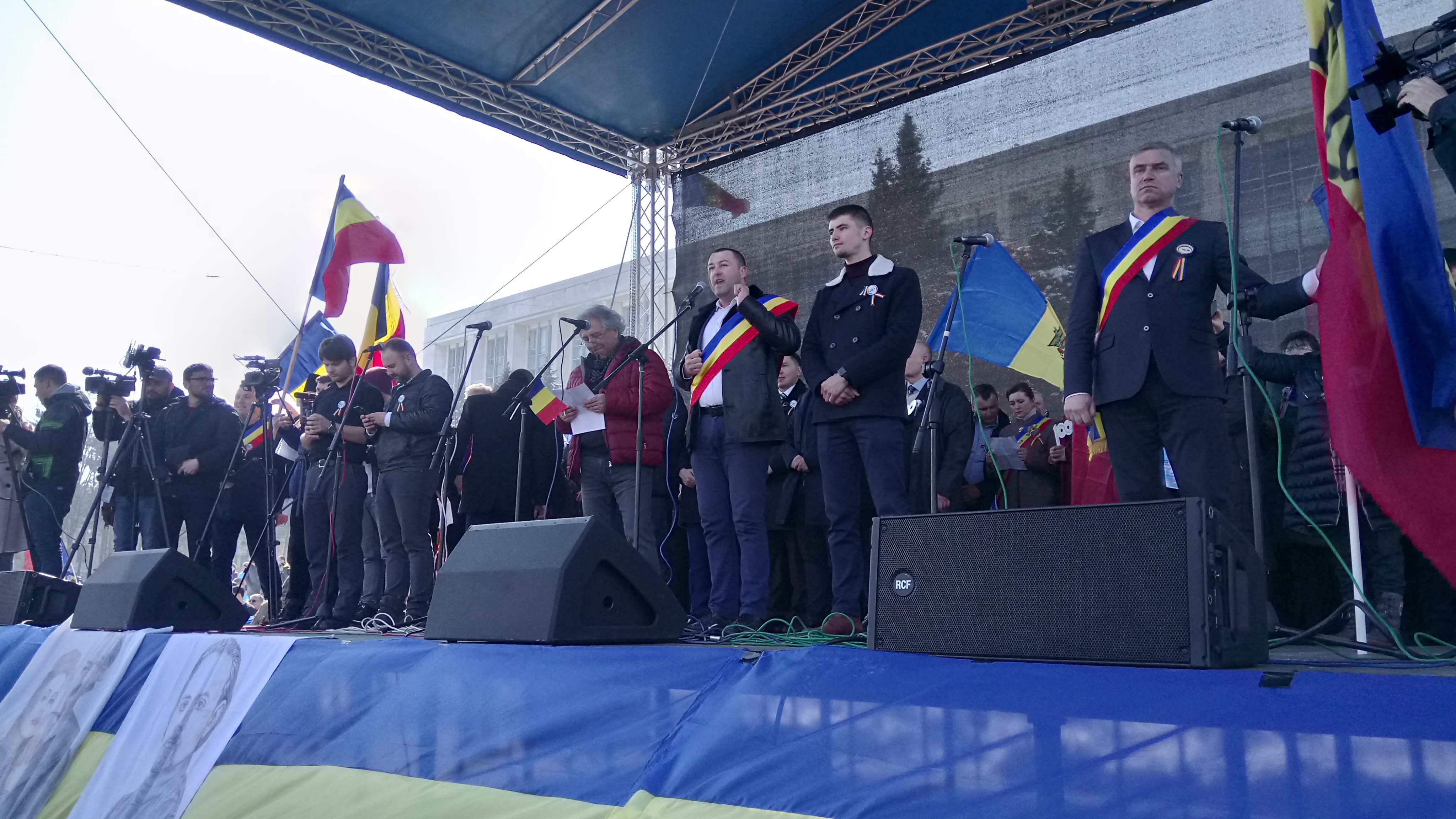 Pe scena din Piața Marii Adunări Naționale au urcat primarii celor 130 de localități din Republica Molodova care au adoptat Decalarația  de reunire cu România, printre ele și primarul de Sadova- localitatea natală a președintelui Dodon și primarul din Pănășești- consăteanul premierului moldovean.