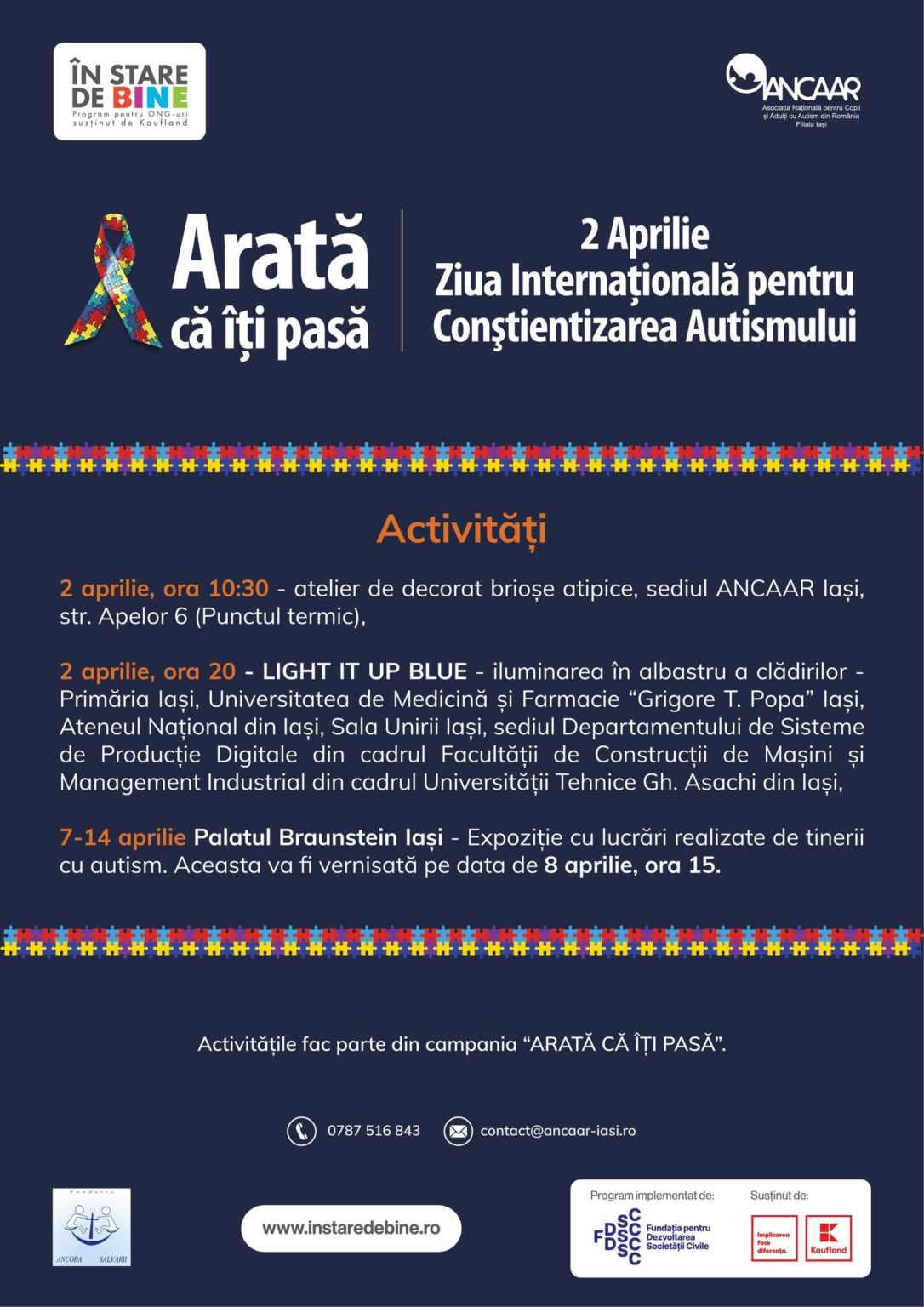 Asociația Națională pentru Copii și Adulți cu Autism din România (ANCAAR), filiala Iași și Fundația Ancora Salvării Iași desfășoară, în luna aprilie 2025, cea de a XVII- a ediție a campaniei ARATĂ CĂ ÎȚI PASĂ, pentru a marca data de 2 Aprilie, Ziua Internațională pentru Conștientizarea Autismului.