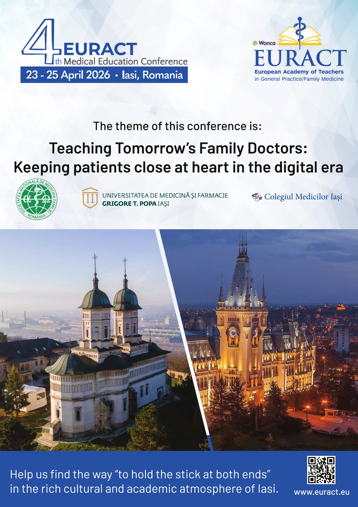 Conferința Educațională EURACT 2026 este organizată de European Academy of Teachers in General Practice/Family Medicine și Societatea Națională de Medicina Familiei din România (SNMF). Partenerii academici și instituționali ai evenimentului sunt Colegiul Medicilor Iași și Universitatea de Medicină și Farmacie „Grigore T. Popa” din Iași (UMF Iași).