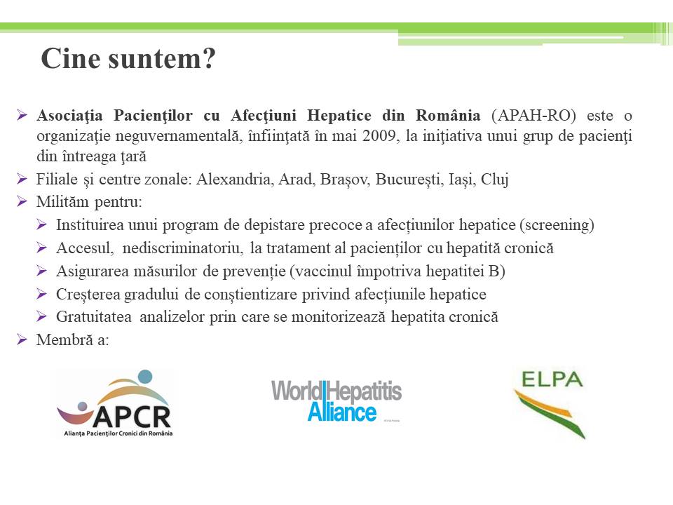 APAH-RO este o entitate neguvernamentală, înfiinţată în 2009, la initiaţiva unui grup de pacienţi din întreaga ţară. Cu sloganul „Pentru drepturile tale!”, organizaţia militează pentru creşterea gradului de depistare şi accesul la tratament. Organizaţia militează pentru creşterea accesului la tratament a pacienţilor cu afecţiuni hepatice, desfăşurând activităţi de informare şi sprijin în rândul pacienţilor cu afecţiuni hepatice, a membrilor familiilor, întruniri cu scopul de a sensibiliza în ceea ce priveşte importanţa depistării cât mai rapide a hepatitelor cronice virale şi a importanţei tratamentului făcut la timp, ţinând cont strict de recomandările medicilor.