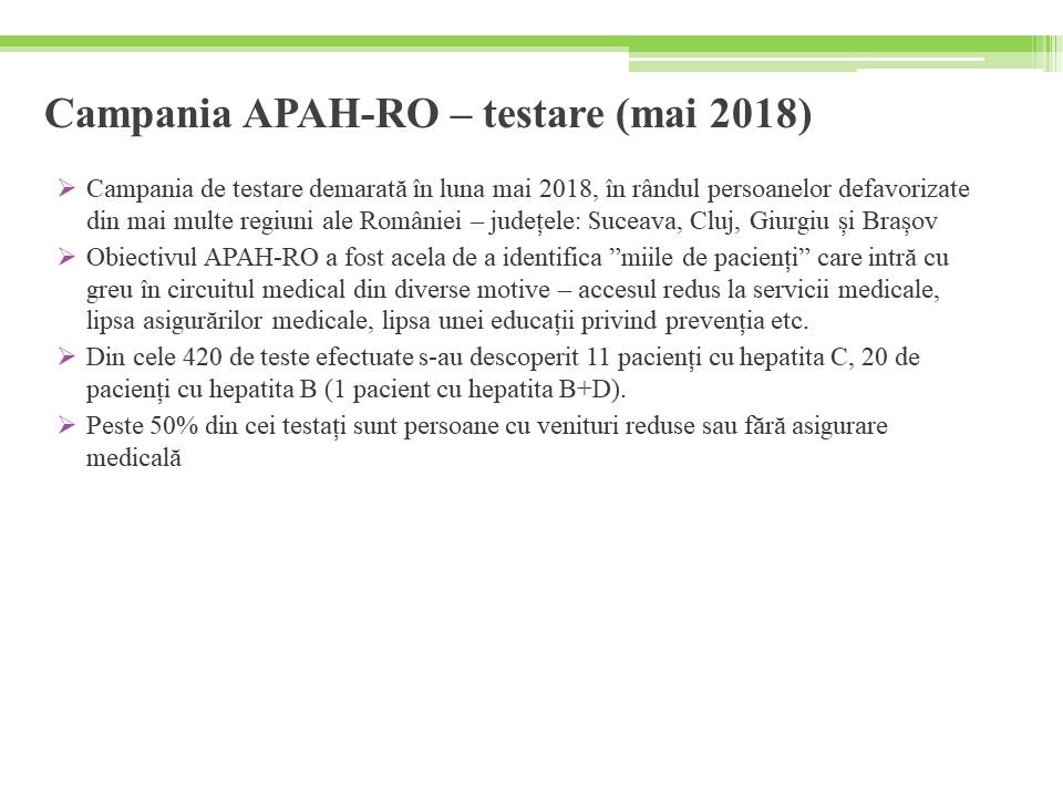 APAH-RO și-a asumat acest rol, de facilitare a diagnosticării, încă de la înființare. În luna mai, anul acesta, asociația a demarat o campanie de testare în rândul persoanelor defavorizate din mai multe regiuni ale României. Din cele 420 de teste efectuate s-au descoperit 11 pacienți cu hepatita C, 20 de pacienți cu hepatita B (1 pacient cu hepatita B+D). Acțiunile de testare s-au desfășurat în județele: Suceava, Cluj, Giurgiu și Brașov. Peste 50% din cei testați sunt persoane cu venituri reduse sau fără asigurare medicală. Obiectivul APAH-RO a fost acela de a identifica ”miile de pacienți” care intră cu greu în circuitul medical din diverse motive – accesul redus la servicii medicale, lipsa asigurărilor medicale, lipsa unei educații privind prevenția etc. În România, aproximativ 600.000 de români trăiesc cu hepatită cronică C, iar aproximativ 800.000 au hepatită cronică B.