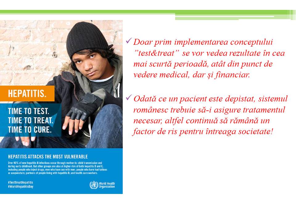 În același timp, doar prin implementarea conceptului ”test&treat” se vor vedea rezultate în cea mai scurtă perioadă, atât din punct de vedere medical, dar și financiar. Odată ce un pacient este depistat, sistemul românesc trebuie să-i asigure tratamentul necesar, altfel continuă să rămână un factor de risc pentru întreaga societate.