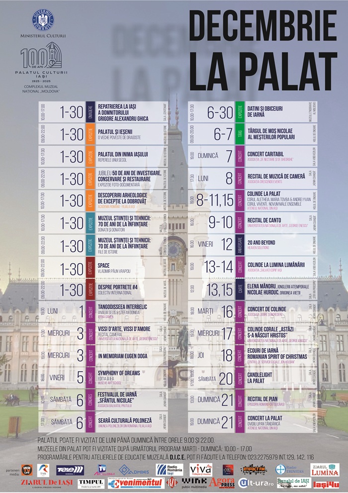 Luna decembrie aduce atmosfera sărbătorilor de iarnă la Palatul Culturii din Iași, prin intermediul a numeroase evenimente: expoziții, târg al meșterilor populari, ateliere de educație muzeală, lansări de carte, proiecte caritabile, concerte și recitaluri organizate alături de parteneri de tradiție: Ateneul Național din Iași, Opera Națională Română Iași, Universitatea Națională de Arte „George Enescu” Iași.