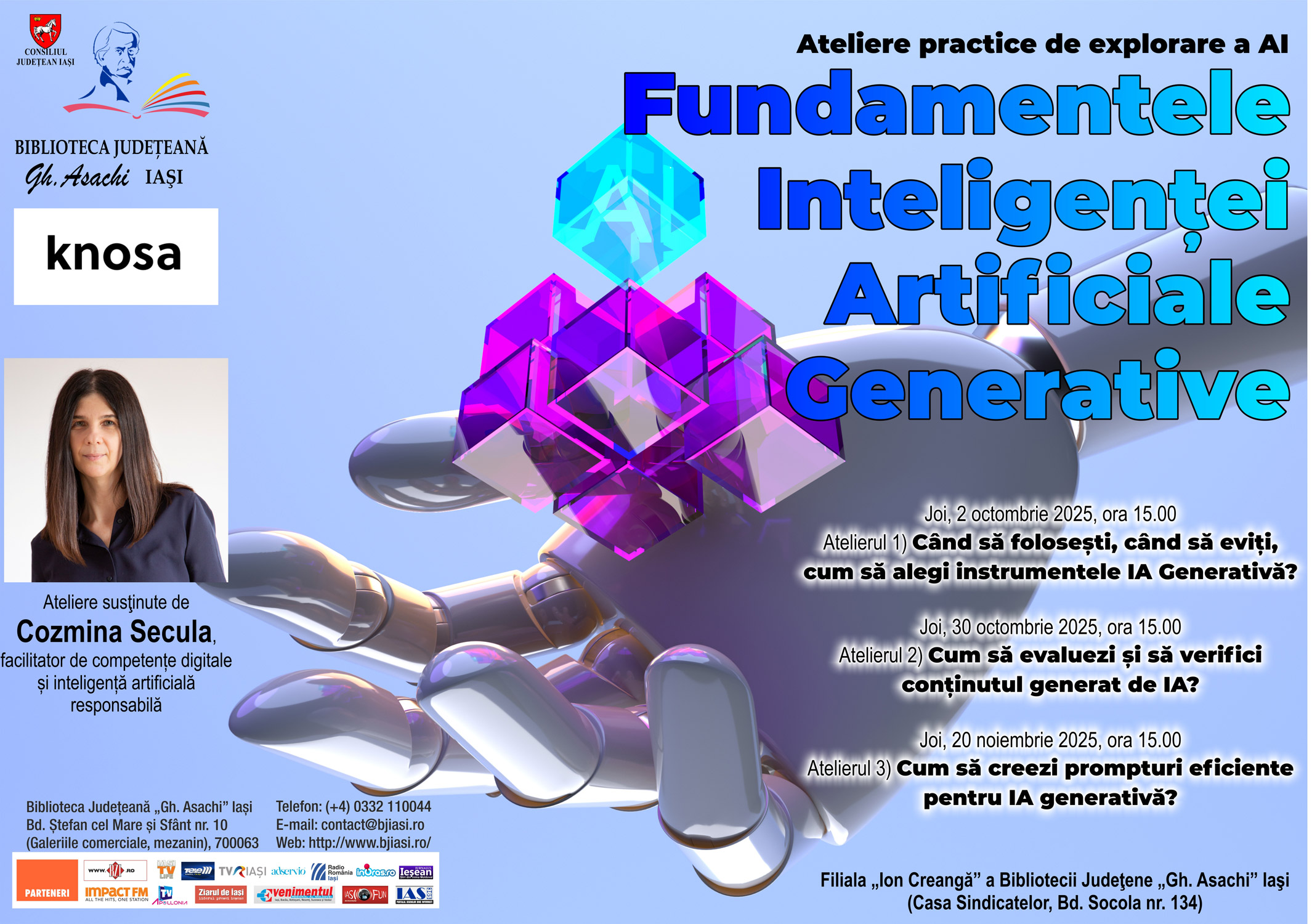 Cele trei ateliere se vor desfășura sub titlul Fundamentele Inteligenței Artificiale Generative, fiecare având o temă distinctă, vor avea loc în zilele de joi (2 și 30 octombrie și 20 noiembrie a.c.), începând cu ora 15.00, la Filiala „Ion Creangă” a bibliotecii (Casa Sindicatelor, Bd. Socola nr. 134) și vor fi susținute de Cozmina Secula, facilitator de competențe digitale și inteligență artificială responsabilă. Fiecare atelier va avea o durată de maximum 2 ore. Nu sunt necesare cunoștințe tehnice. Participanții vor lucra pe device-ul personal (telefon, tabletă, laptop).