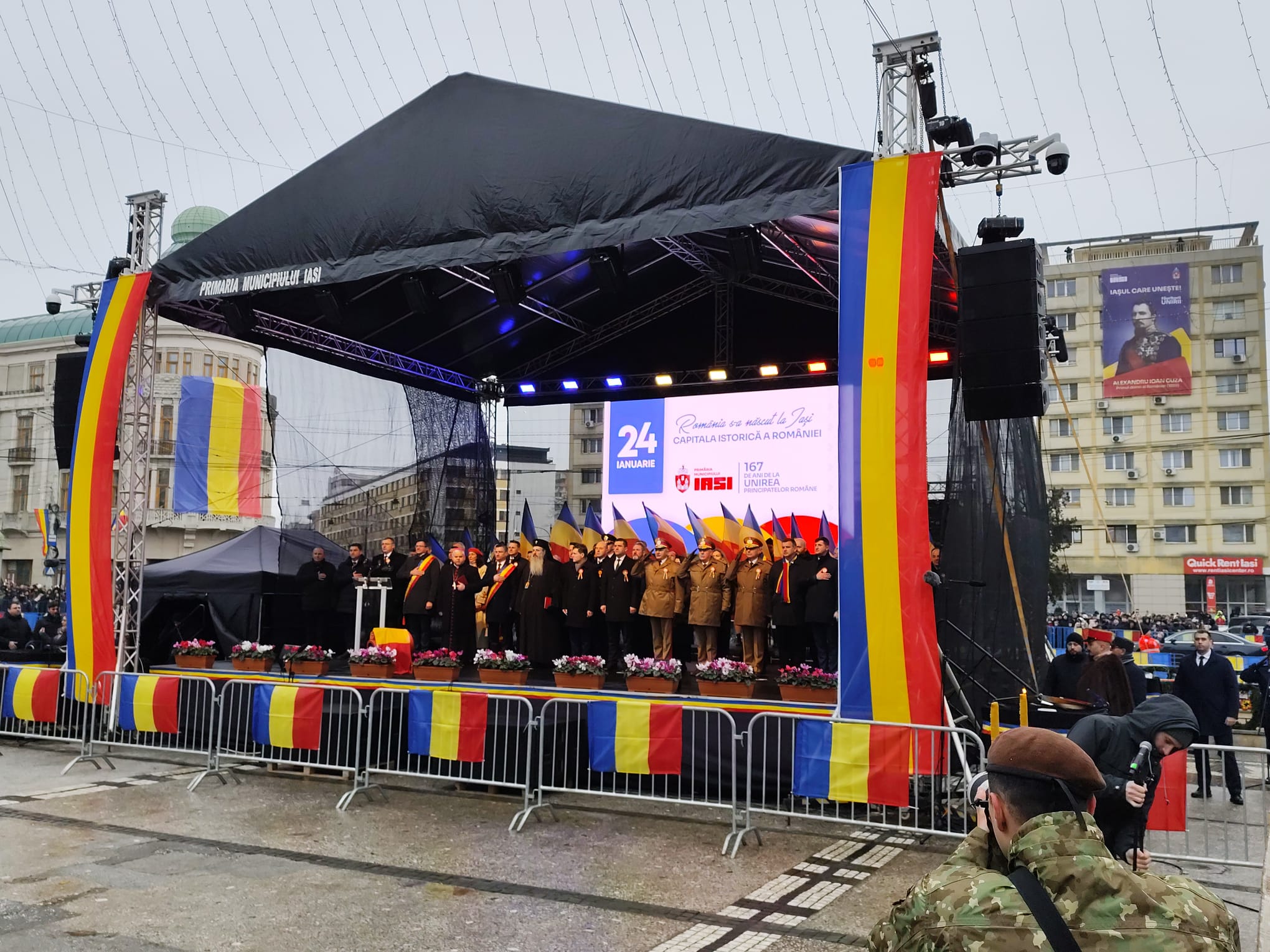 UPDATE ora 15:00 Aproximativ 3000 de persoane s-au adunat în preajma Pieţei Unirii din Iaşi, pentru a celebra 167 ani de la înfăptuirea unirii Moldovei cu Ţara Românească. Pe fondul amenajărilor din zonă, doar câteva sute de oameni au acces efectiv în piață, restul fiind în zonele din apropiere.