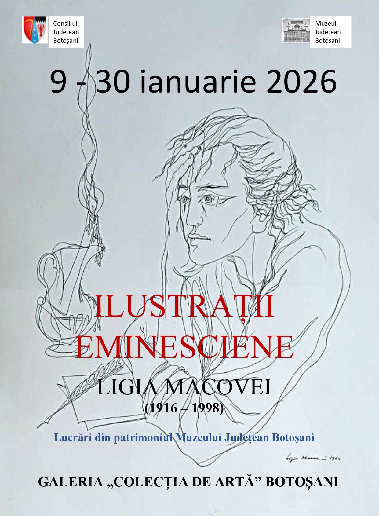 Muzeul Județean Botoșani găzduiește, în perioada 9-30 ianuarie 2026, în spațiul Galeriei „Colecția de Artă” Botoșani, expoziția de grafică „Ilustrații eminesciene”, eveniment dedicat Zilelor Eminescu.