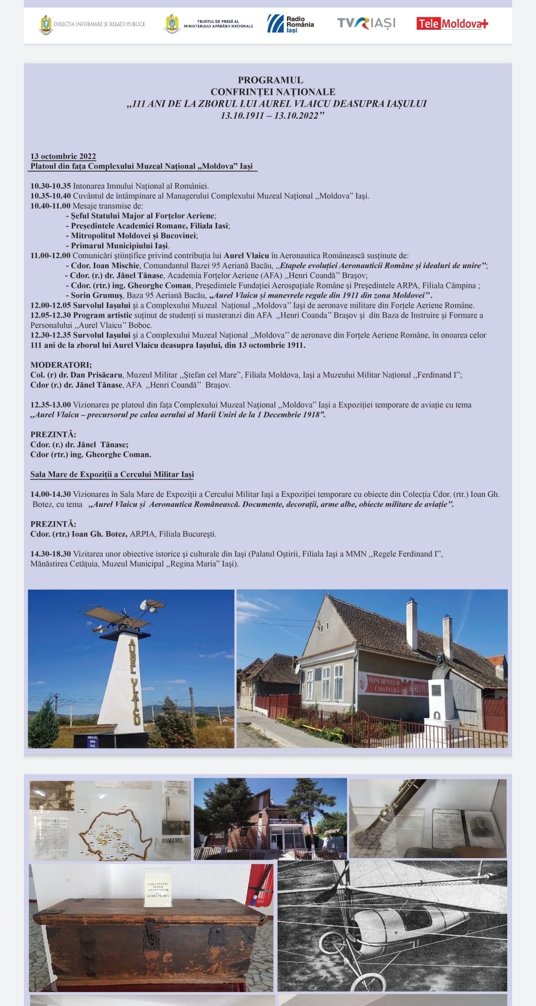 UPDATE, Joi, 13 oct 2022 – La Iaşi a început, astăzi, Conferința Națională cu tema ,,111 ani de la zborul lui AUREL VLAICU deasupra Iașului”.