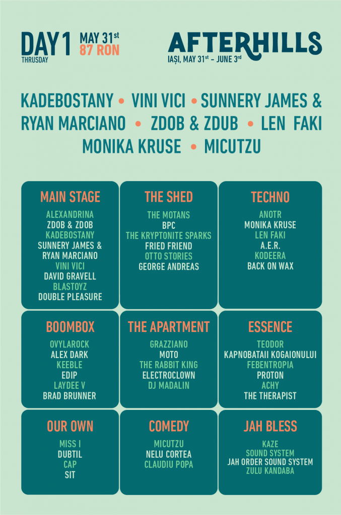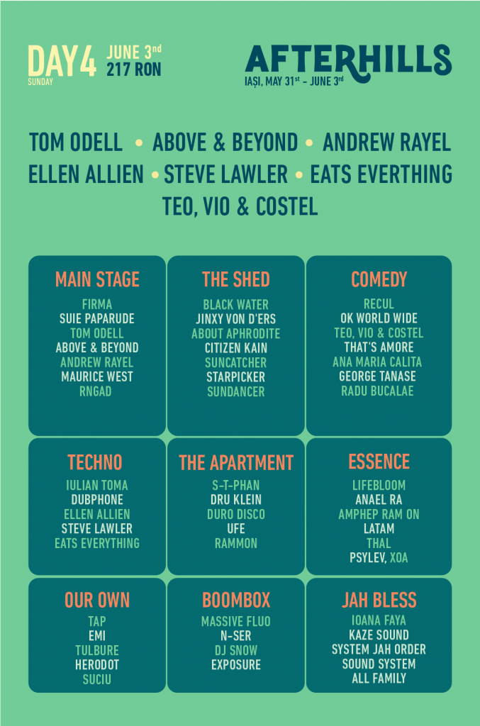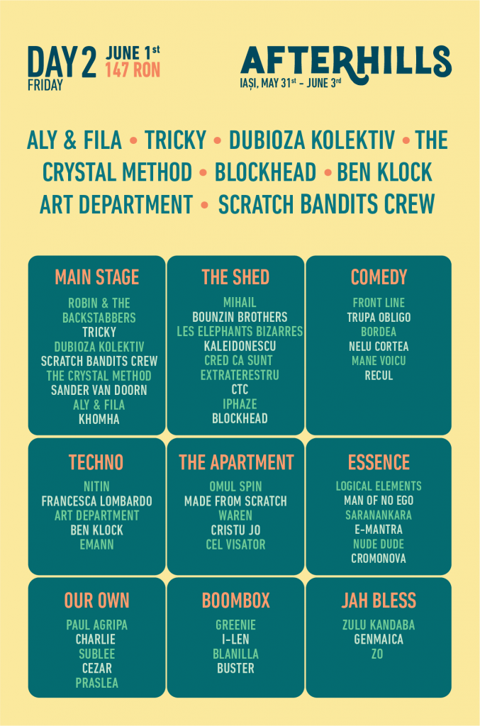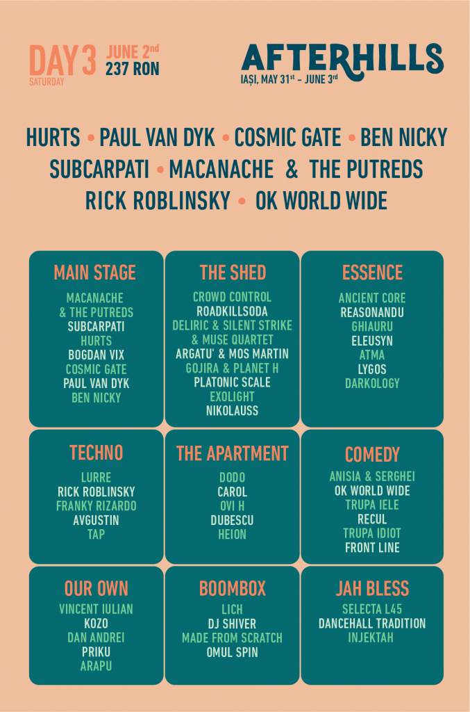 AFTERHILLS este un festival în aer liber care propune nu doar muzică, ci și un mini-concediu pentru toată familia, cu numeroase activități pe timp de zi, spațiu de joacă pentru copii, instalații și ateliere de artă modernă, zone umbrite de lounge, zonă de food & drinks. Biletele se pot achiziționa online de pe site-ul festivalului: afterhills.com.