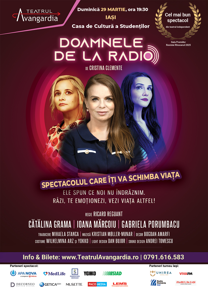 Se spune că în momentul în care reușești să râzi de lucrul care te sperie cel mai tare, acel lucru își pierde puterea asupra ta. Duminică, 29 martie, de la ora 19:30, scena Casei de Cultură a Studenților din Iași devine spațiul unei întâlniri remarcabile: „Doamnele de la Radio”, spectacolul care transformă una dintre cele mai mari temeri umane într-o explozie de umor și solidaritate.