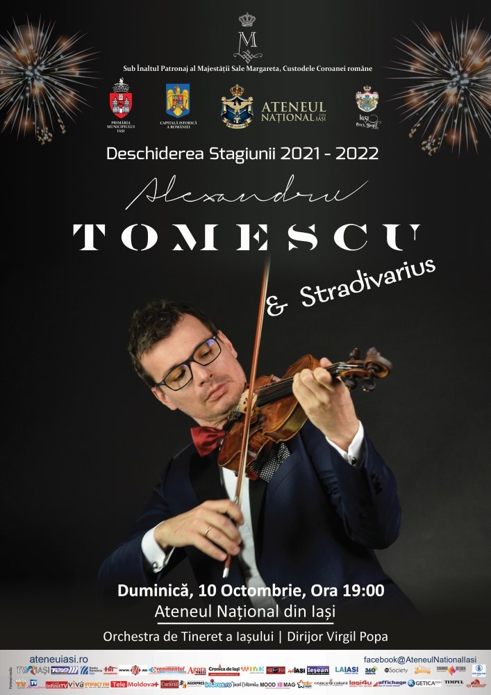 Duminică, 10 octombrie, ora 19 00 , tot în Sala Mare de Spectacole „Radu Beligan”, va concerta Alexandru Tomescu cu vioara Stradivarius, alături de Orchestra de Tineret a Iașului, dirijor Virgil Popa.