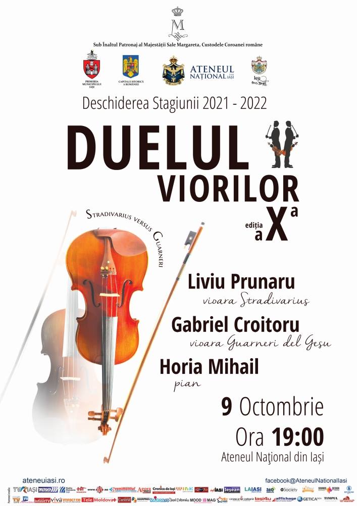 Astfel, sâmbătă, 9 Octombrie 2021, de la ora 19:00, pe scena Ateneului vor urca Liviu Prunaru – concertmaestrul orchestrei Concertgebouw Amsterdam, care cântă pe vioara Stradivarius Pachoud și Gabriel Croitoru – solist concertist al Orchestrelor și Corurilor Radio, Filarmonicilor din Cluj-Napoca și Ploiești, care cântă pe vioara Guarneri del Gesu Catedrala (pusă la dispoziție de Muzeul Național „George Enescu”, în al cărui patrimoniu se află), acompaniați de pianistul Horia Mihail, în „Duelul Viorilor”, ediția a X-a.