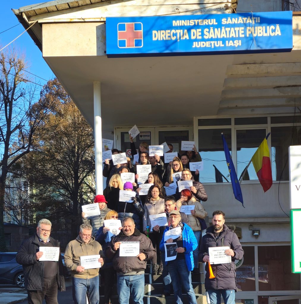 Aproxiamtiv 50 de angajați ai Direcției de Sănătate Publică Iași au protestat, astăzi, în fața instituției timp de oră.