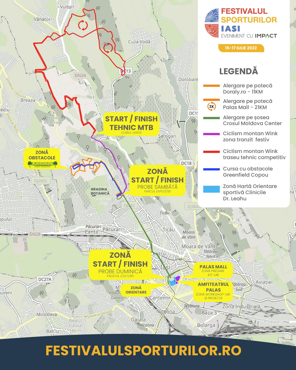 Organizatorul evenimentului, Silviu Bălan, a declarat că toate competițiile vor avea loc în Parcul Expoziției și în Zona Palas: ”Vineri seara vom avea worshop despre ciclism. Bogdan Duca, campionul României la ciclism montan, va veni și va da niște sfaturi celor care sunt ori la început de drum, ori poate au întrebări despre ciclism. Voi urma eu, eu sunt sportiv de performanță. Voi avea un worshop despre alergare montană. Vom avea un film despre un makingof filmului ”România Sălbatică”. Sâmbătă dimineața vom începe probele sportive din Parcul Expoziției, cu alergarea pe potecă, cursa cu obstacole și ciclismul montan. Seara ne întoarcem înapoi la Palas, la amfiteatru și vom avea workshop de orientare sportivă, cu Ionuț Zincă, campion balcanic și dintre cei mai buni alergători montani din lume și apoi vom avea o prezentare a unei expediții făcute în acest an, două vârfuri de 8000 de metri în 24 de ore, Gabriel Băicuș. Duminică dimineață ne mutăm cu startul la Palatul Culturii și vom avea alergare pe șosea, 10 kilometri, plecăm din Piața Palat și mergem până în Copou și înapoi. Apoi avem Cursa Copiilor, Cursa Persoanelor cu Dizabilități și încheiem acest festival cu proba de Orientare Sportivă, care se va face pe o hartă cu detalii a Grădinilor Palas.