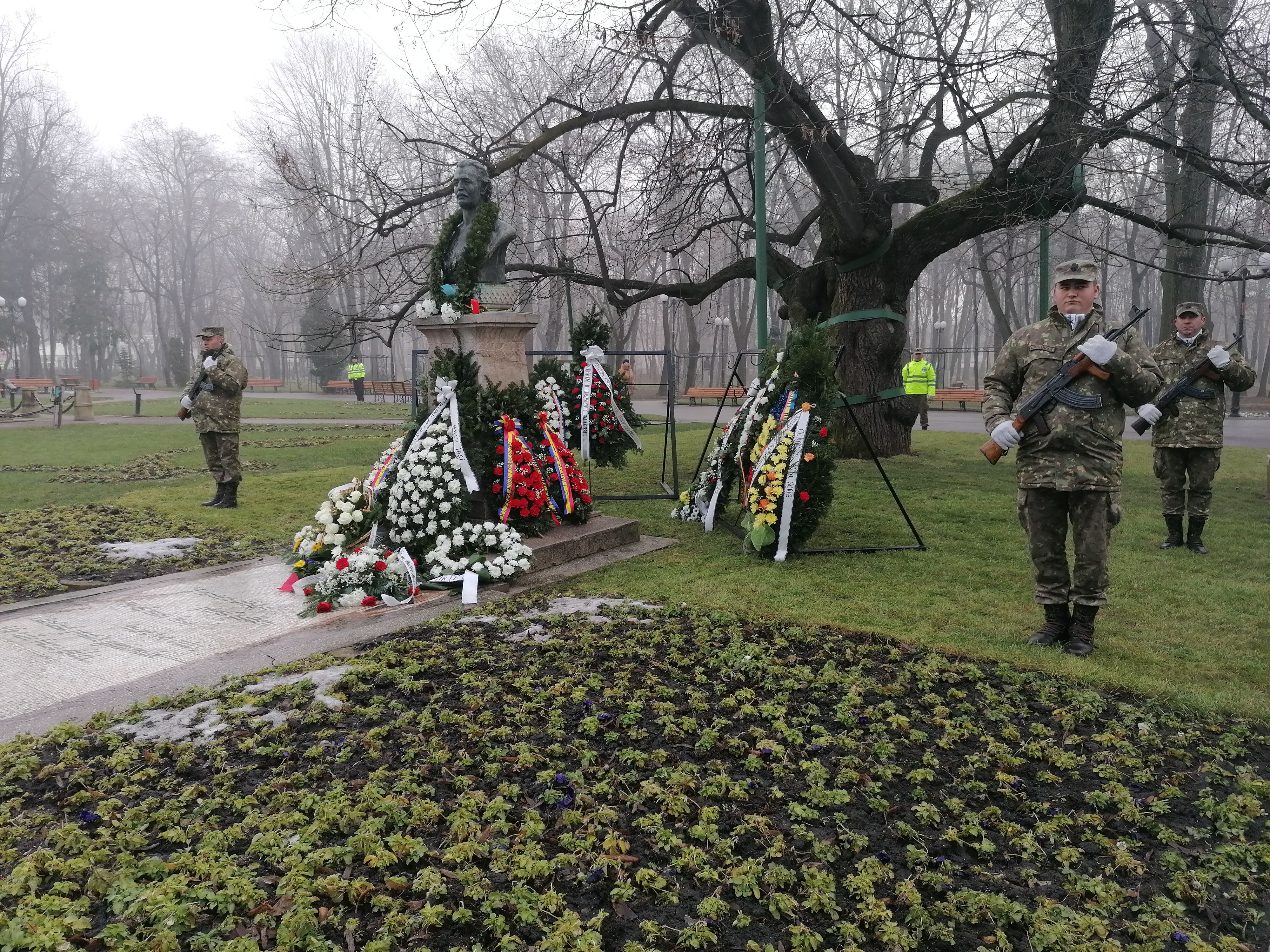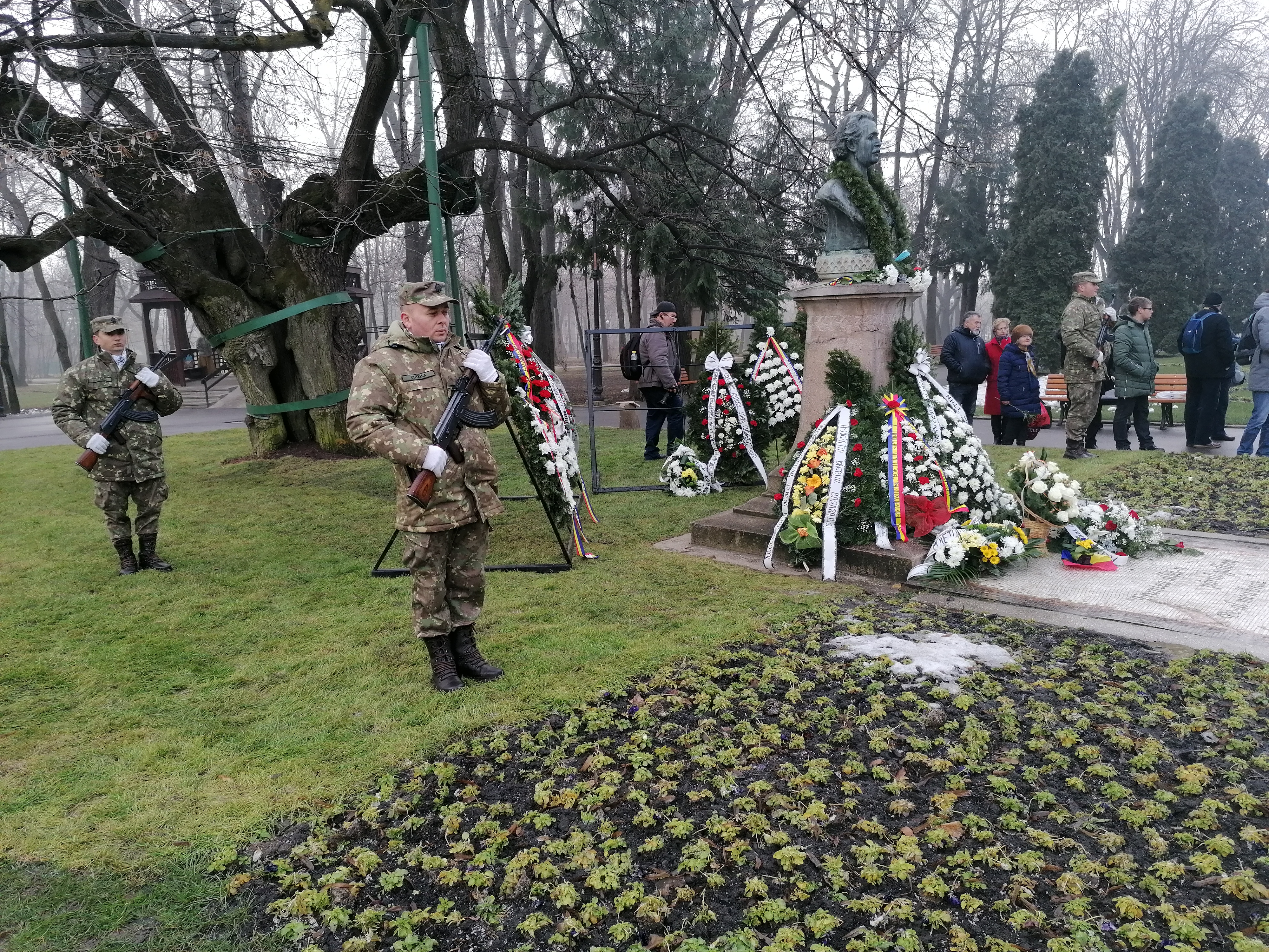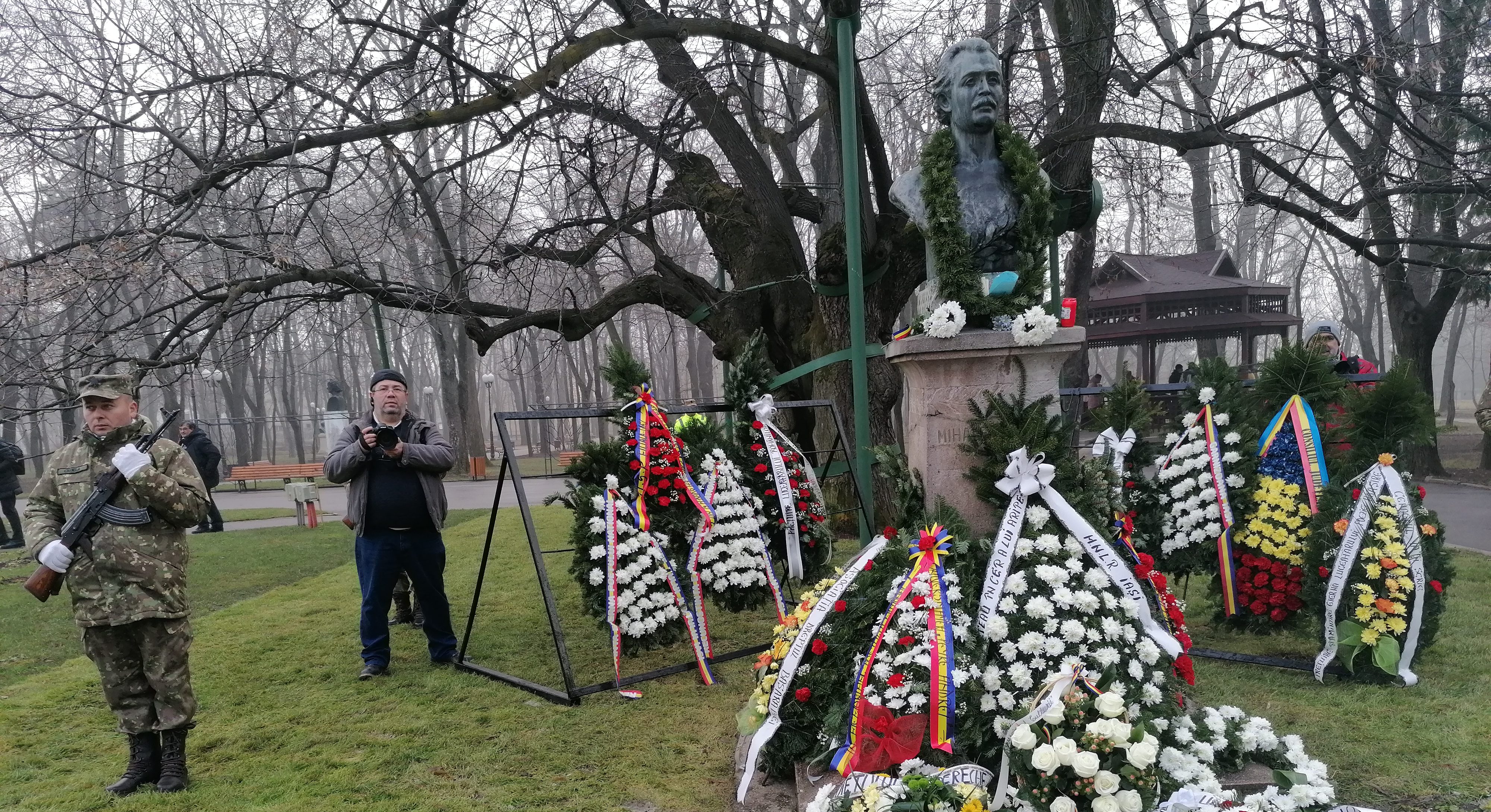 La statuia poetului naţional şi la Teiul lui Eminescu, din Parcul Copou, astăzi, au avut loc, ceremonialuri militar şi religios, şi au fost depuse coroane de flori din partea oficialităţilor.
