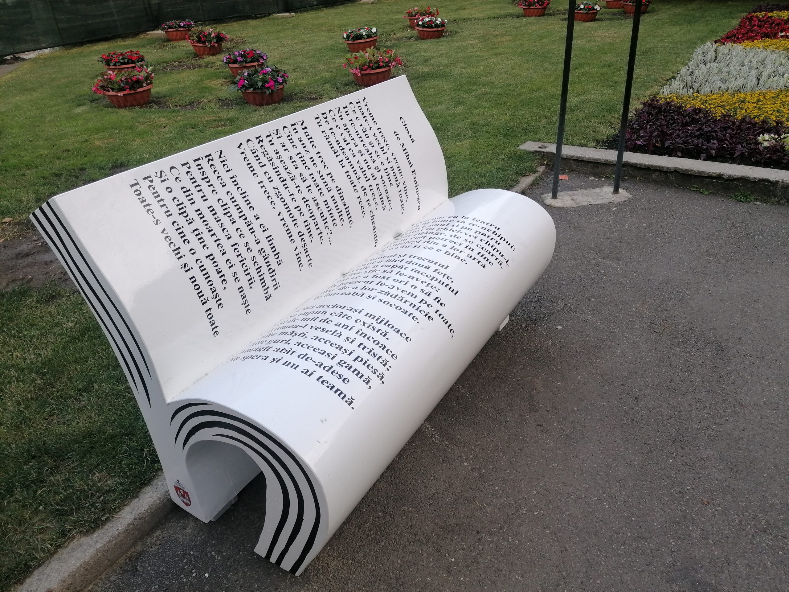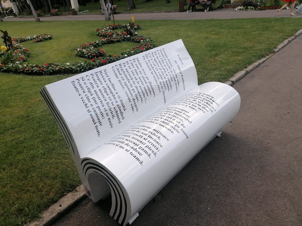 Mihai Chirica: Am adus un concept, zic eu, care va atrage atenția niște bănci sub formă de carte, pe care am scris versuri. Deocamdată am început cu Mihai Eminescu, dar vom continua și cu alți poeți și ne vom duce în toate parcurile din oraș. Avem deja 22 de bănci fabricate, le fabricăm în atelierele noastre și credem noi că am reușit să atragem atenția într-un mod pozitiv. Sunt mai greu de vandalizat, sigur, cu excepția vopsirii, dar nu pot fi mutate de acolo au peste 1,2 tone. Am mai găsit și în alte părți bănci similare care aminteau de poeți. Am găsit fântâni care aveau scrise pe zonele din care ieșea apa versurile unui poet celebru din localitatea sau țara respectivă, deci elemente de identificare între localitatea Iași și cultura și istoria acestei localități care mi-au atras atenția.