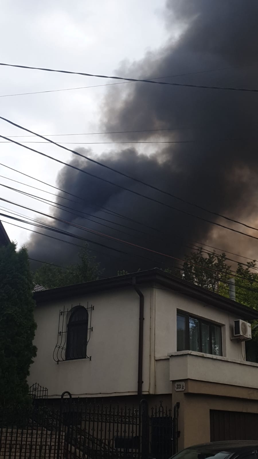Pompierii se luptă cu focul, în timp ce un fum gros a cuprins întreaga zonă.
