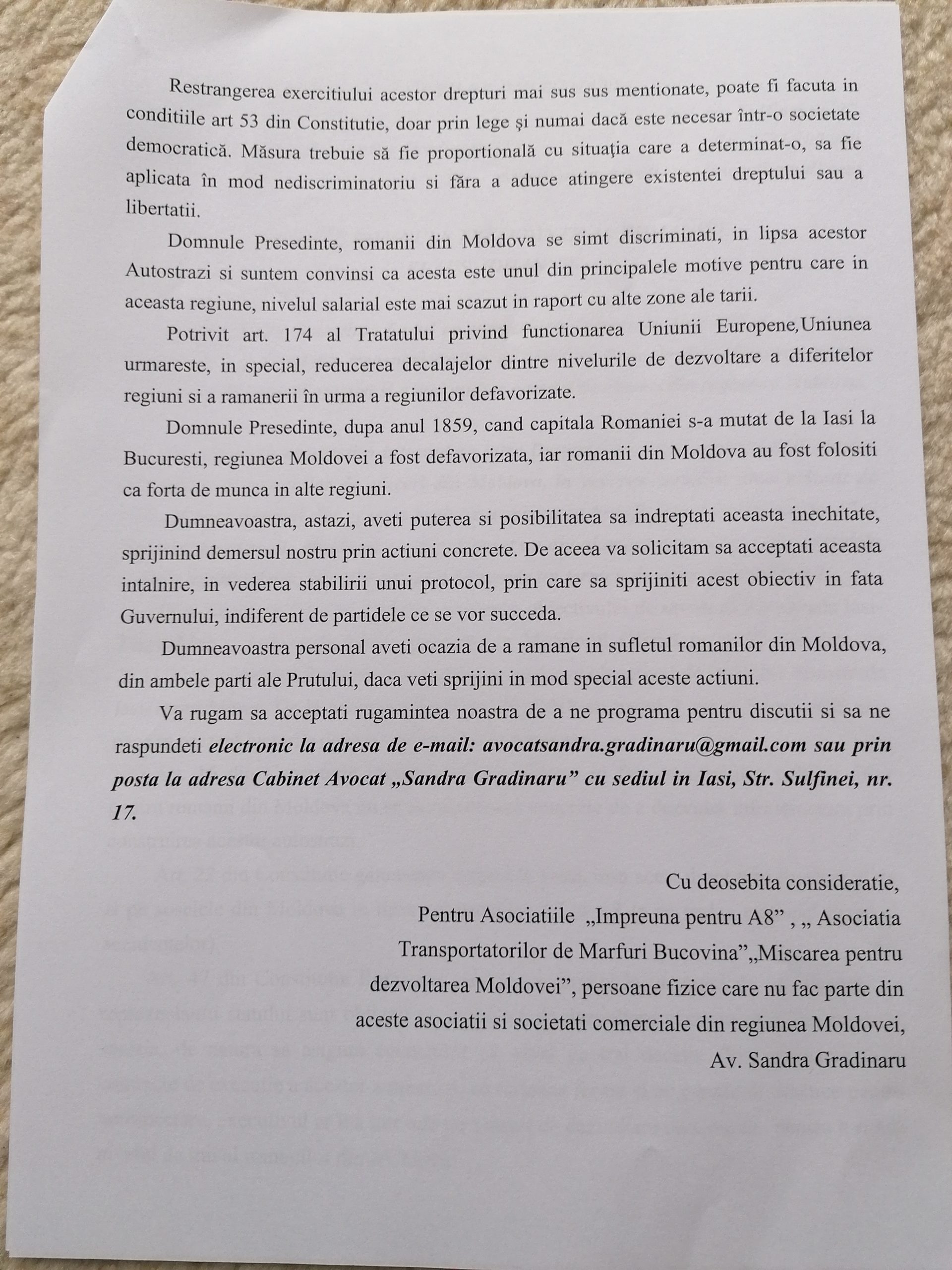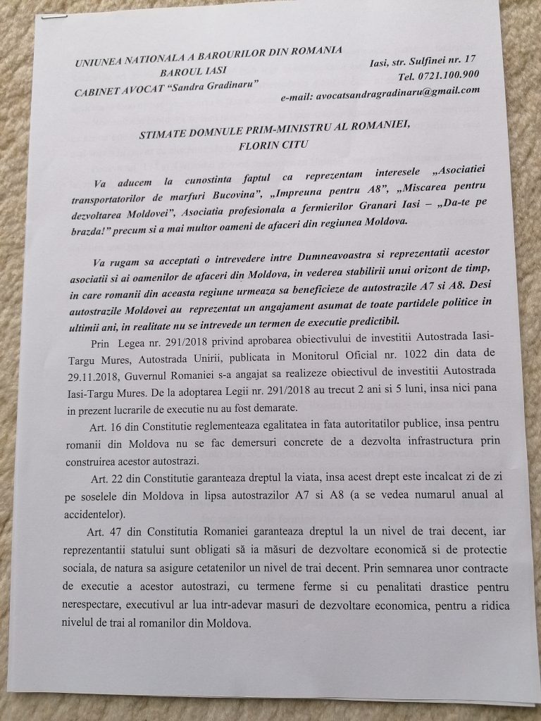 Reprezentanții asociațiilor transportatorilor, a oamenilor de afaceri, fermierilor și ONG-urile care militează pentru construirea autostrăzilor în zona Moldovei cer întrevederi cu președintele și premierul, pentru a stabili termene precise în vederea constuirii autostrăzilor A7 și A8. În acest sens, ei au trimis, astăzi, două scrisori instituțiilor statului.