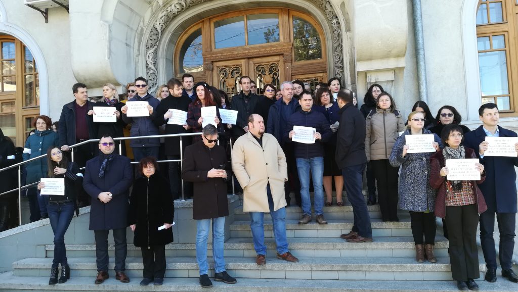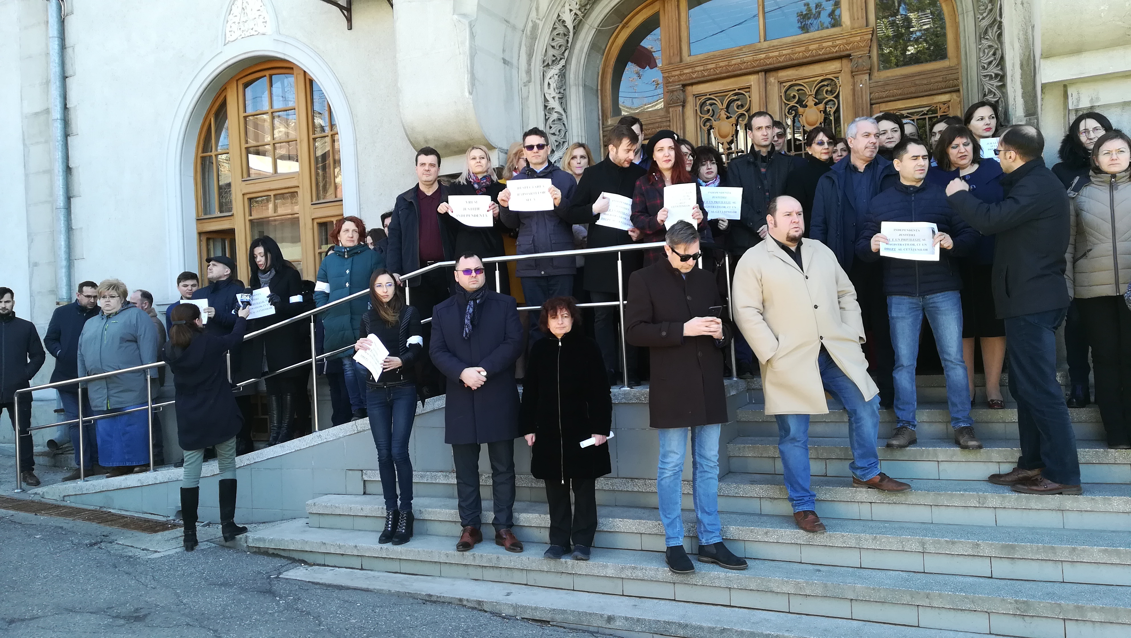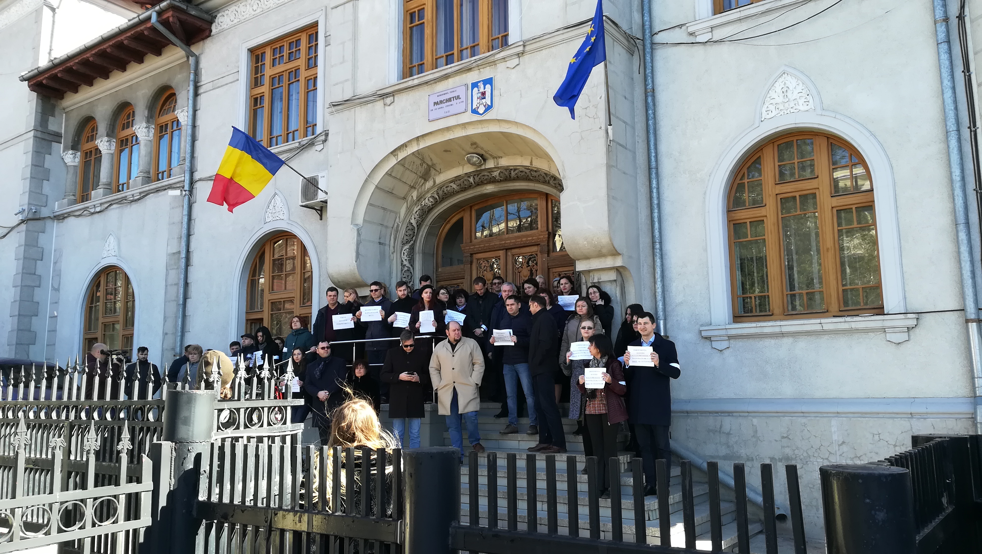 Toţi procurorii de la Parchetele de pe lângă Judecătorie, Tribunal, Curtea de Apel şi DIICOT Iaşi au protestat astăzi, timp de o jumătate de oră, în faţa sediului instituţiei.