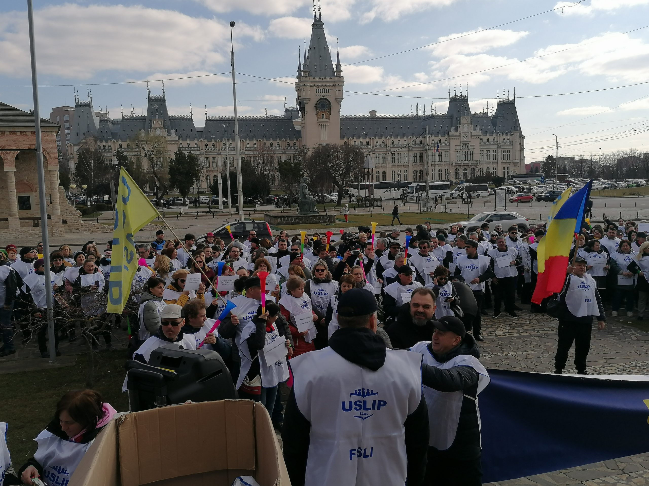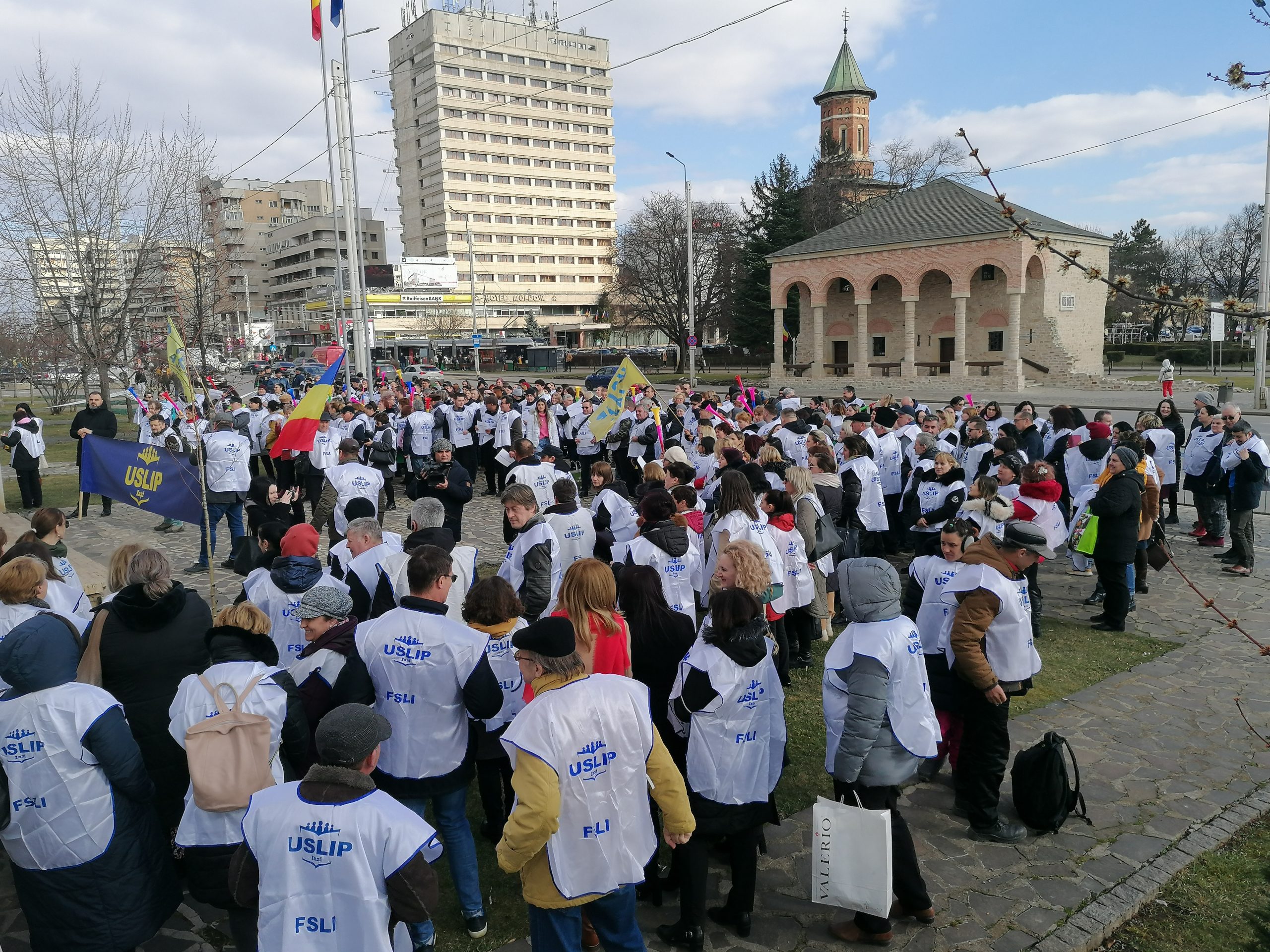 (AUDIO/FOTO) Protest al sindicaliştilor din învăţământ, în fața Prefecturii Iași