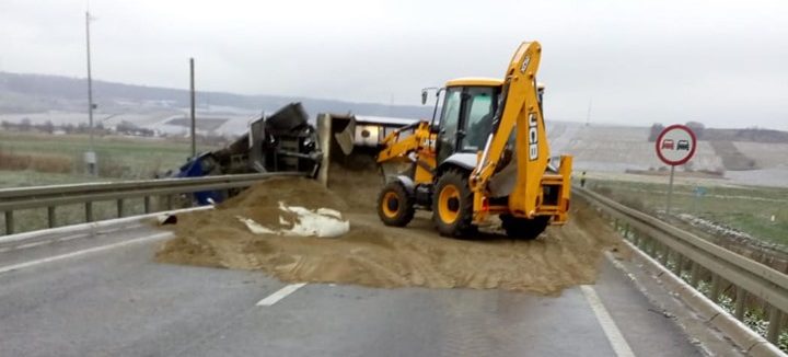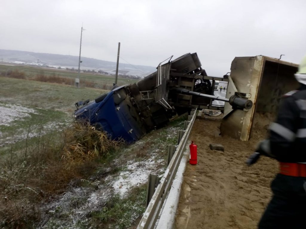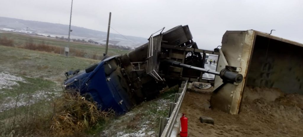 Un autocamion încărcat cu nisip s-a răsturnat pe DE 581, blocând ambele sensuri de circulație.