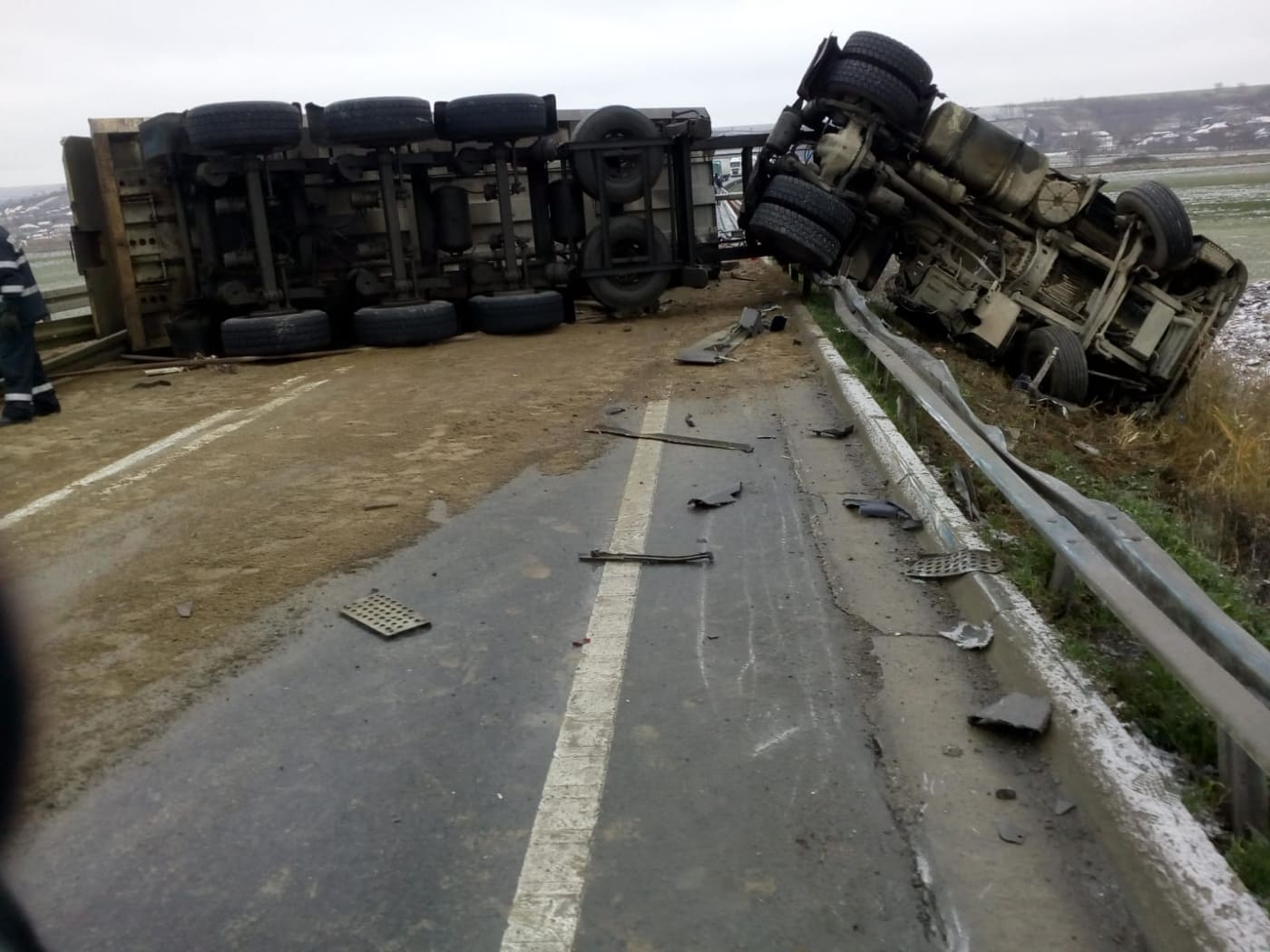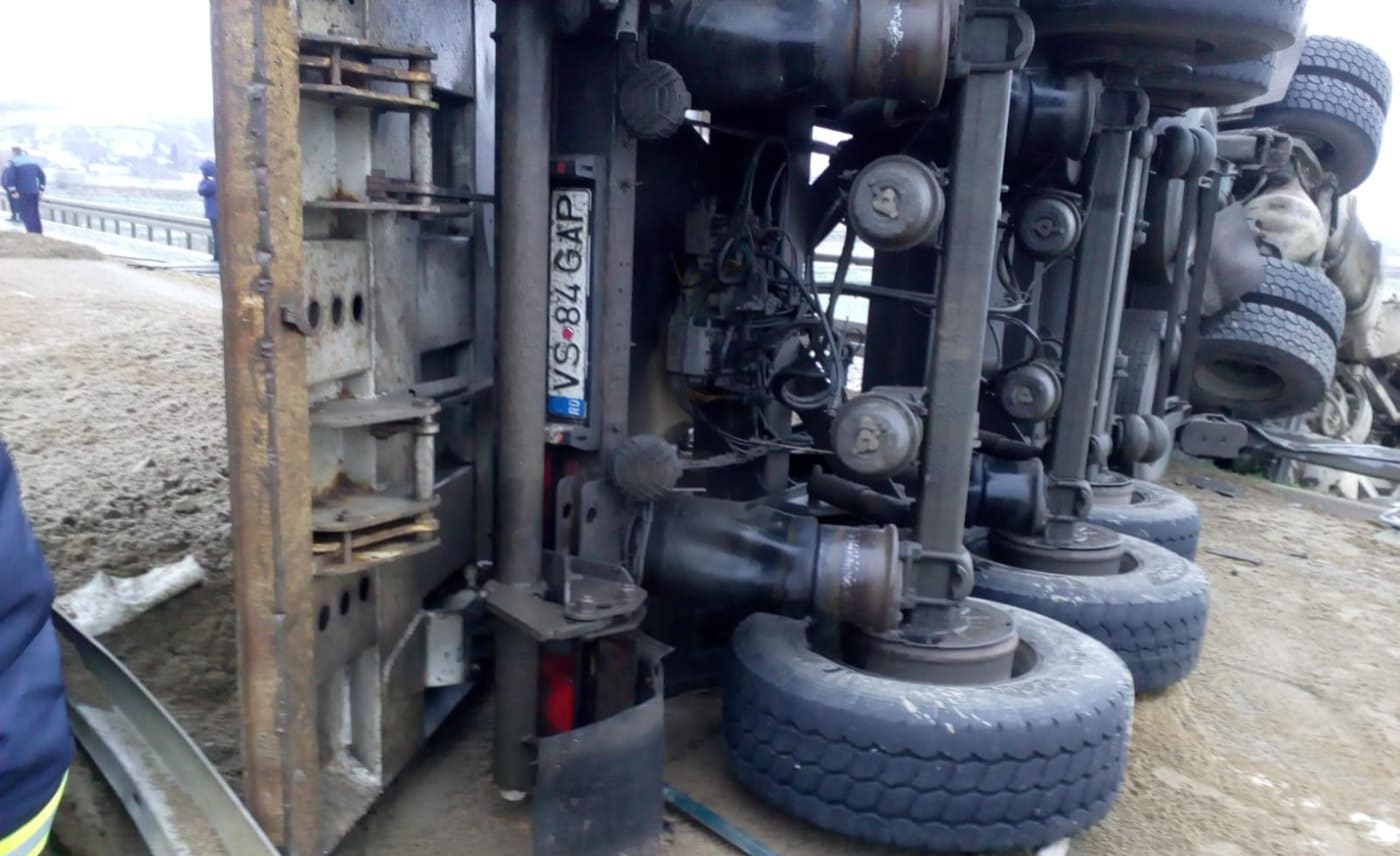 Un autocamion încărcat cu nisip s-a răsturnat pe DE 581, blocând ambele sensuri de circulație.