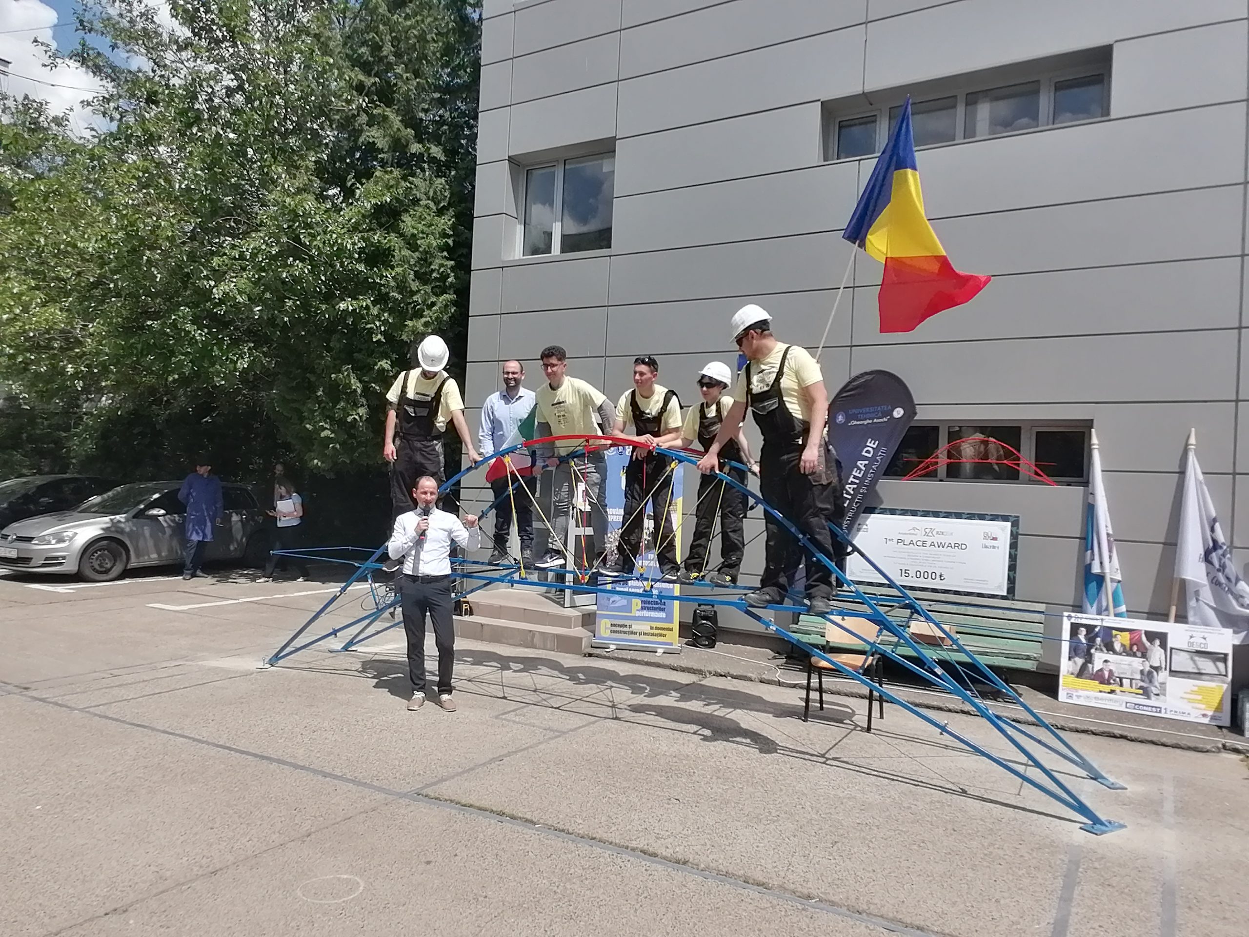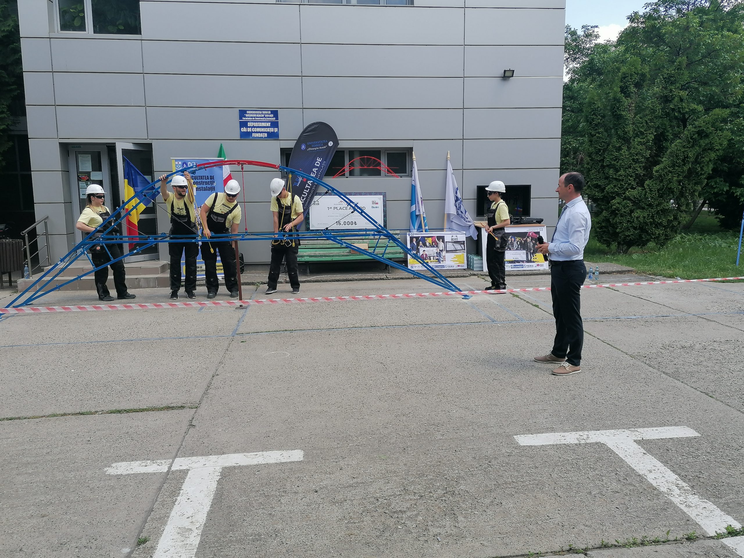 Gheorghiță Boacă, profesorul coordonator, a precizat care au fost cele patru probe ale concursului: Studenții de la Facultatea de Construcții și Instalații din Iași au participat la Concursul Internațional Design & Construct, ei având ca temă să proiecteze și să execute o machetă de pod. Concursul este unul foarte complex, are patru probe distincte. Prima probă este de estetică și unicitate, în care podul este apreciat de diferite persoane, nu neapărat din punct de vedere tehnic. Apoi proba de greutate a structurii – se apreciază o greutate cât mai mică a structurii, ceea ce implică un consum mic de materiale. Apoi proba de montaj contratimp, în care studenții iau rolurile unor macarale și a unei barje pentru a realiza podul după niște reguli foarte, foarte stricte și clare. Iar proba de foc a fost proba de rezistență, în care podul ar trebui să susțină o greutate de 1.250kg și la această proba au obținut cel mai bun rezultat. Anul acesta avem locul I general – la toate secțiunile.