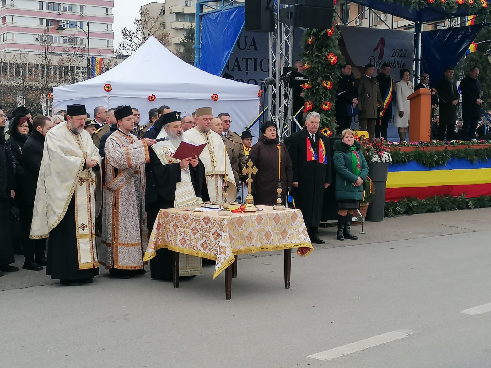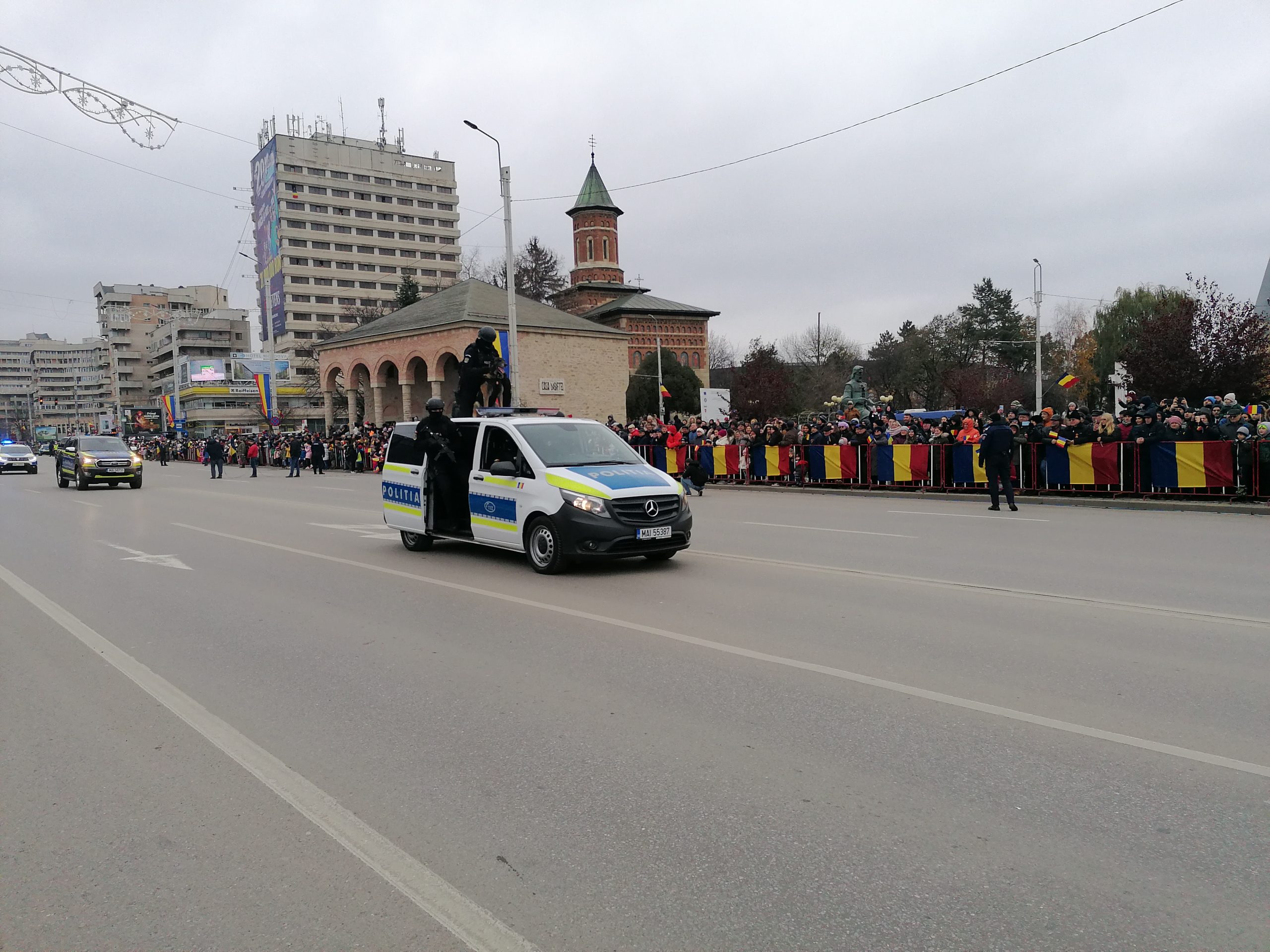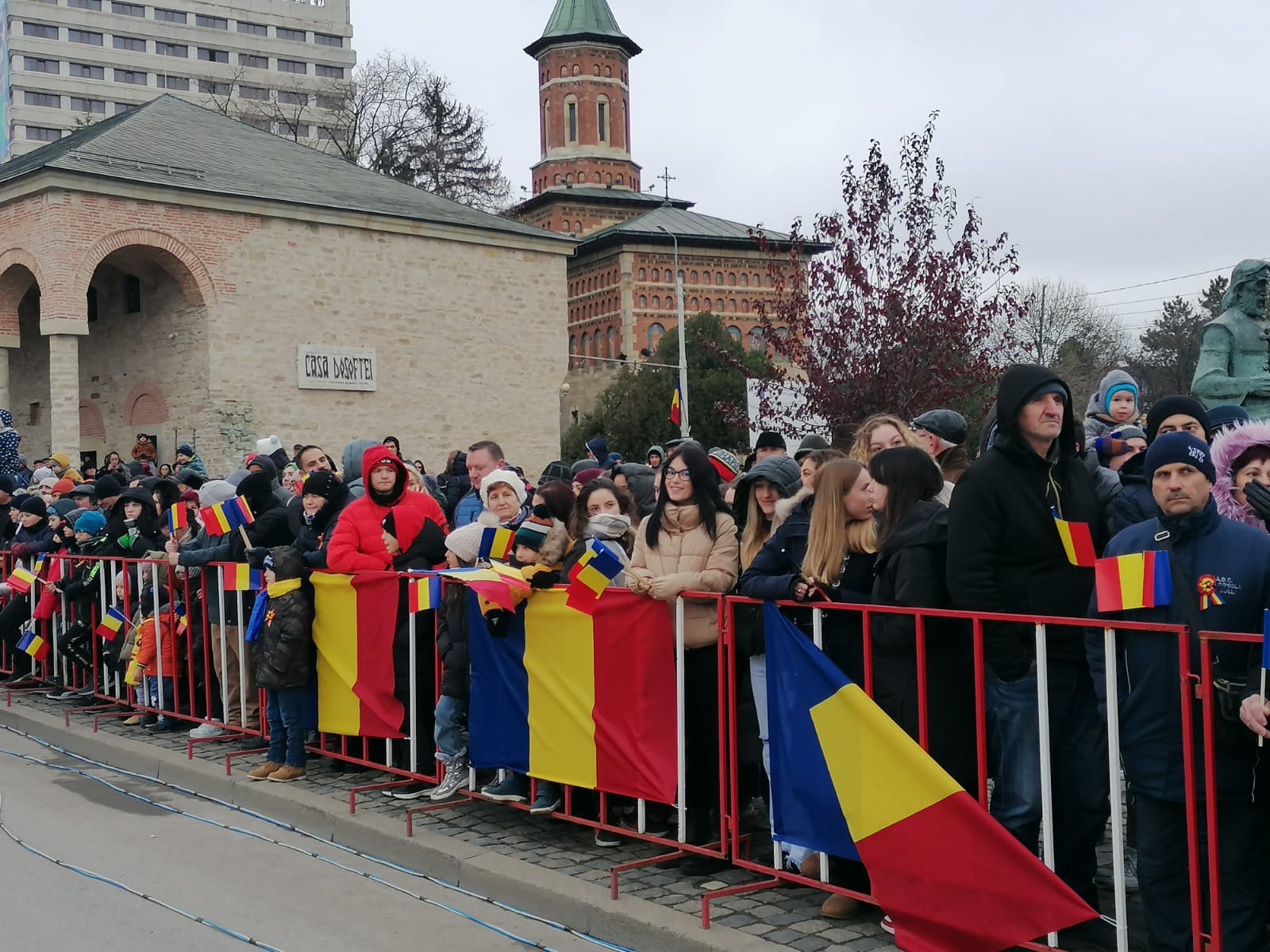 La ora 11:00, Piața Palatului Culturii este plină de oameni care urmăresc ceremonialul militar și religios.