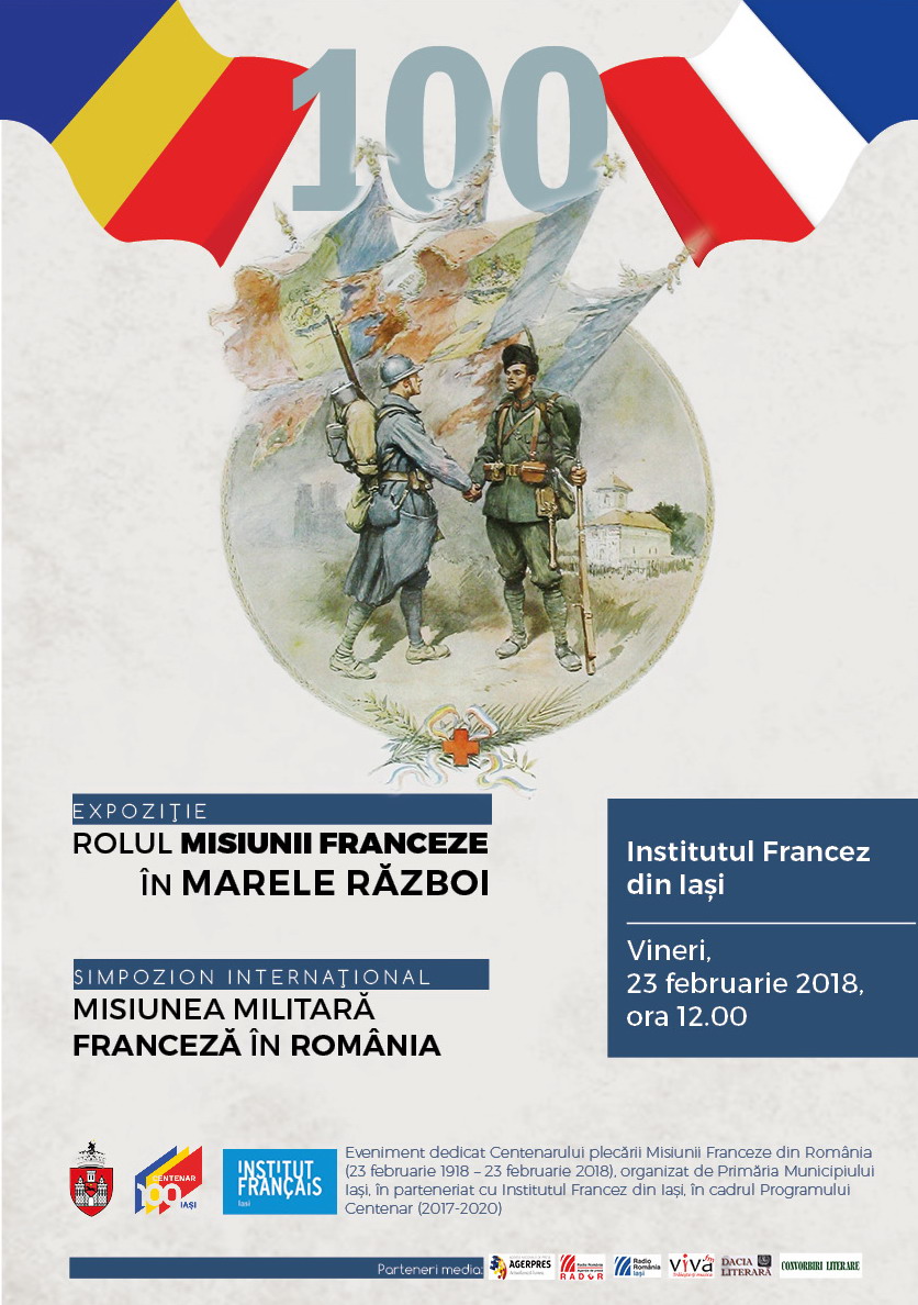 O primă etapă a acestui proiect va avea loc pe data de 23 februarie 2018, când, în parteneriat cu Institutul Francez din Iași, vom marca împlinirea Centenarului plecării Misiunii Militare Franceze din România, manifestare ce va include derularea lucrărilor Simpozionului „Misiunea Militară Franceză în România”, la care vor participa istorici francezi și români, precum și vernisarea expoziției intitulate „Rolul Misiunii Militare Franceze în Marele Război”, al cărei curator este istoricul Sorin Iftimi și a cărei prezentare va fi realizată de istoricul Aurica Ichim. Cele două evenimente vor avea loc la Institutul Francez din Iași, începând cu ora 12.00.