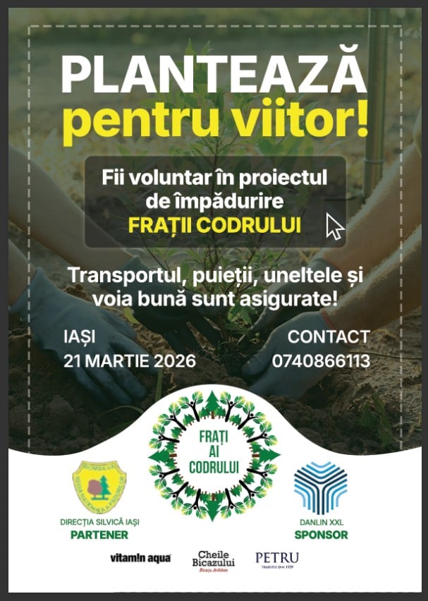 Participanții vor beneficia de transport, unelte și puieți asigurați, iar la finalul activității sunt invitați la un picnic de socializare în aer liber, pe malul lacului de agrement Schitu Duca.